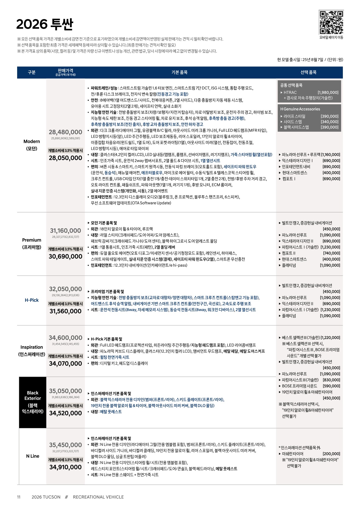 2025년 8월 투싼 신차가격표 (2026년형 투싼 출시)