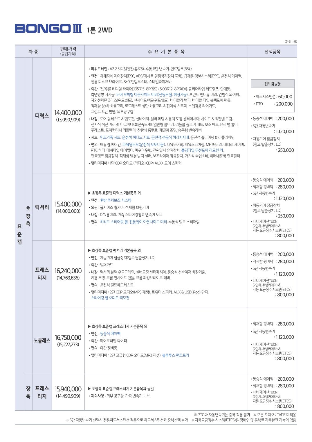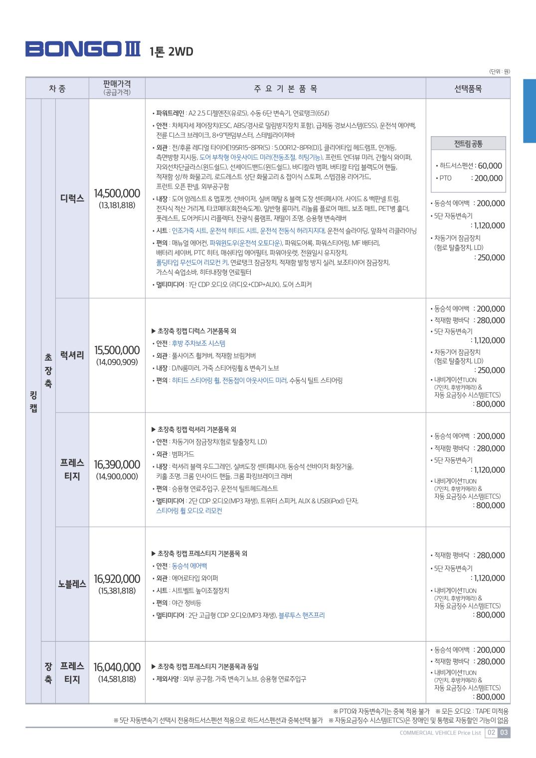 2014년 11월 봉고3 신차가격표
