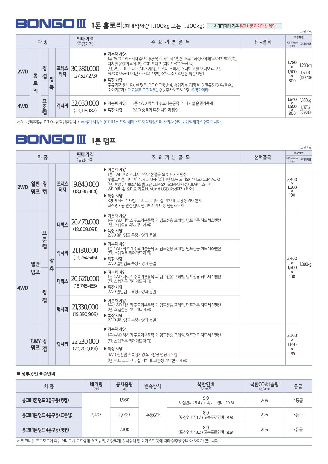 2016년 9월 봉고3 신차가격표