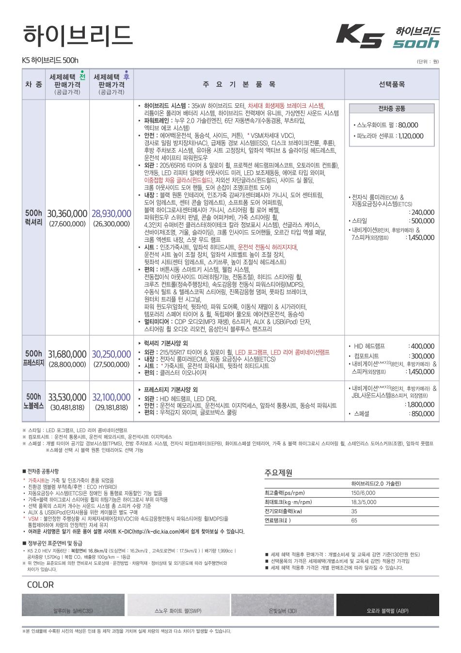 2014년 1월 K5 하이브리드 신차가격표