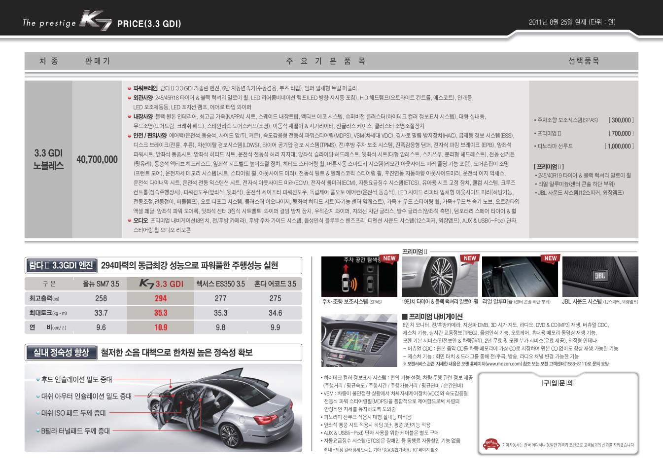 2011년 8월 K7 3.3 GDi 신차가격표