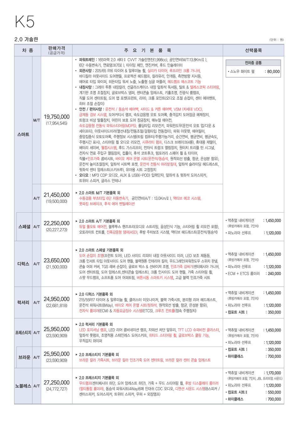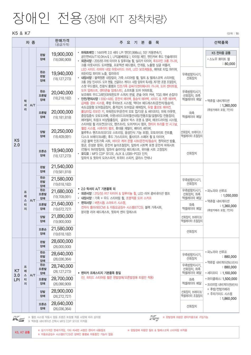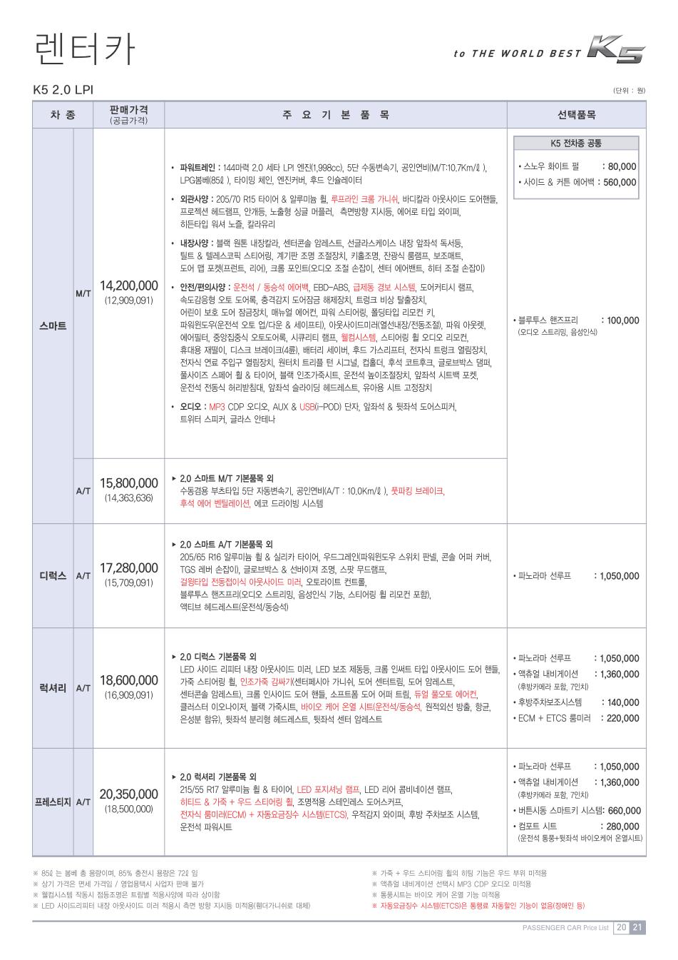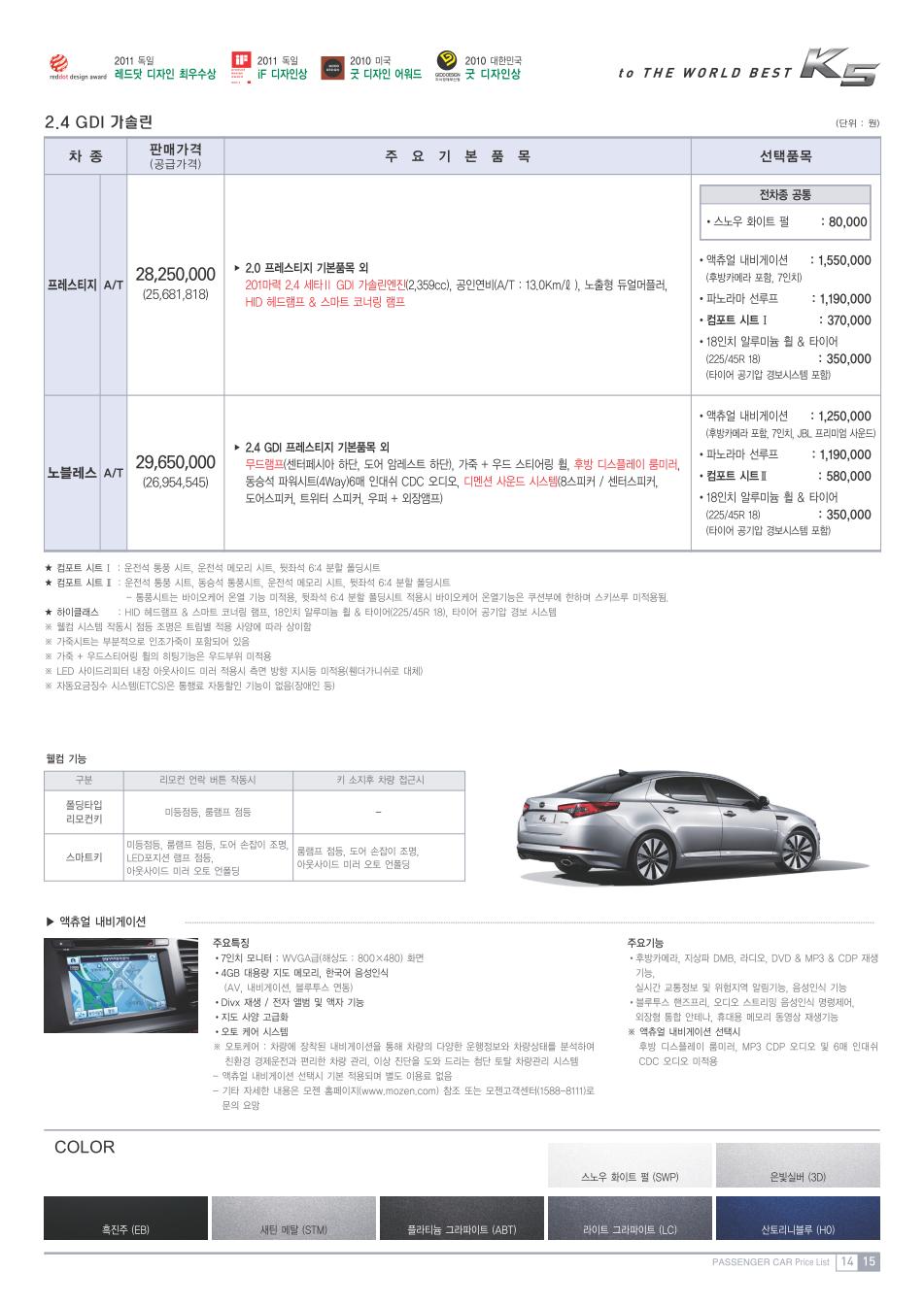 2011년 7월 K5 신차가격표 (K5 터보 출시 / LPi 누우엔진으로 변경)
