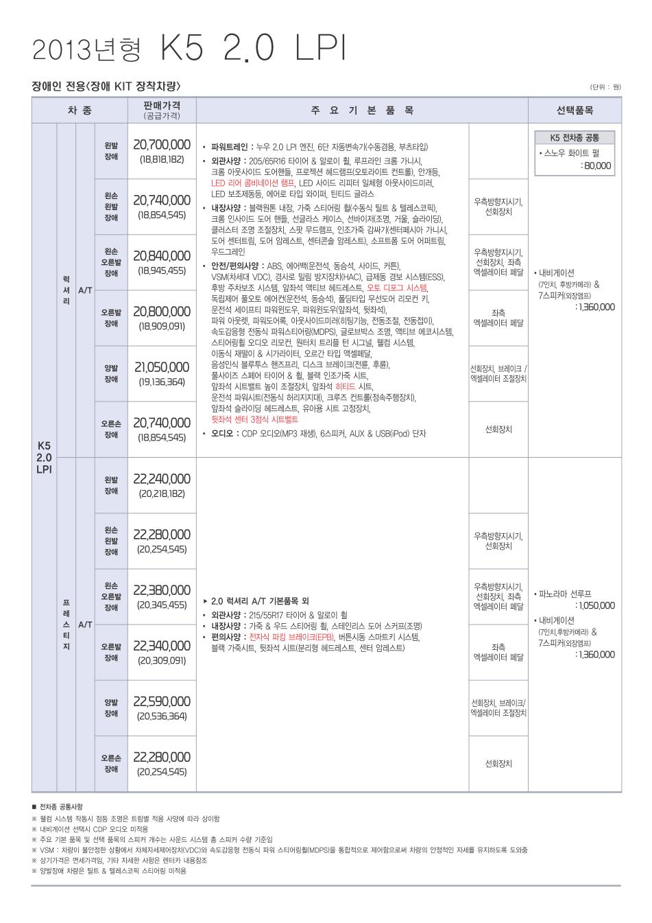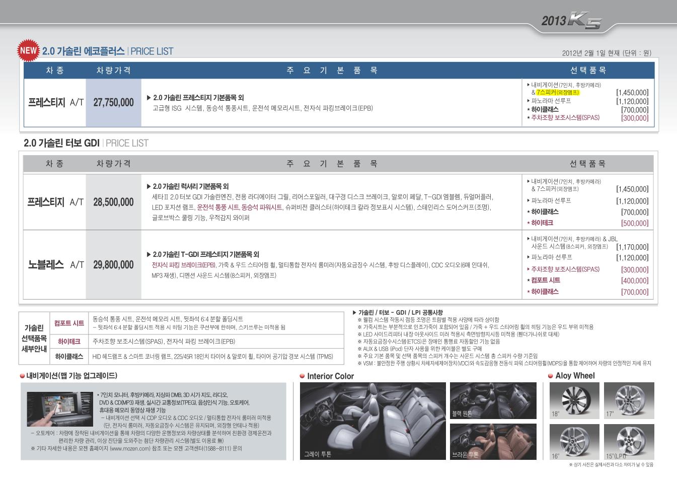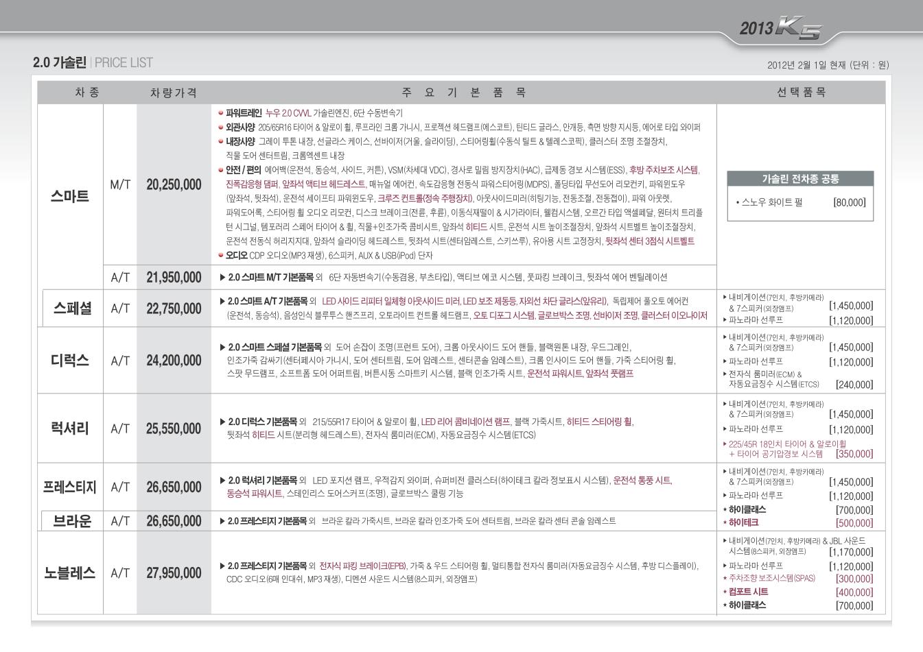 2012년 2월 K5 신차가격표 (가솔린 누우 CVVL 엔진 적용)