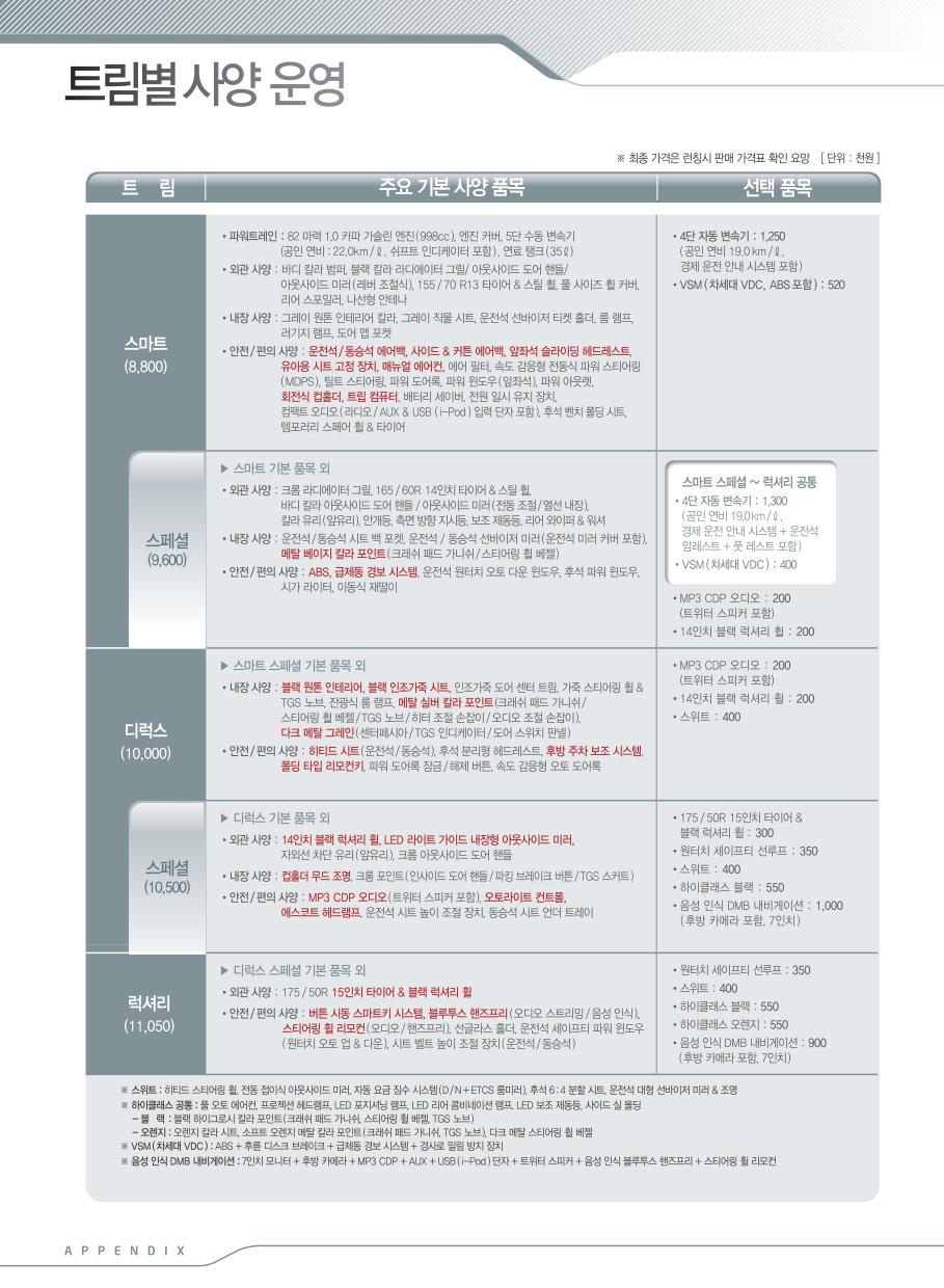 2010년 12월 뉴모닝 신차가격표 (LPG 포함)