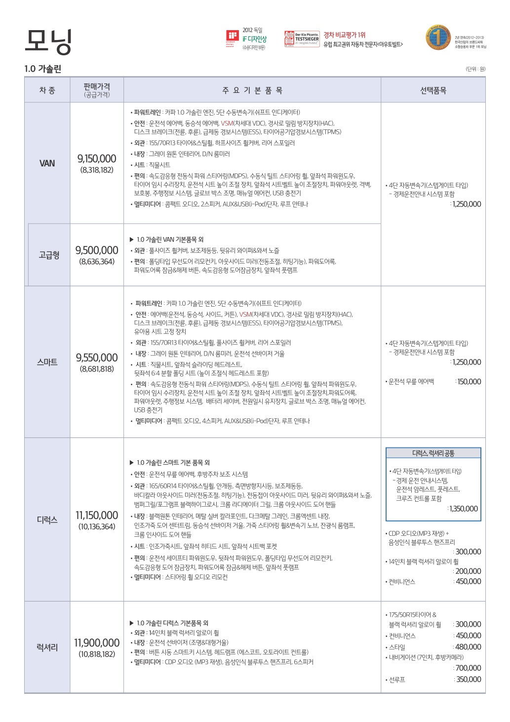 2014년 11월 올뉴모닝 신차가격표