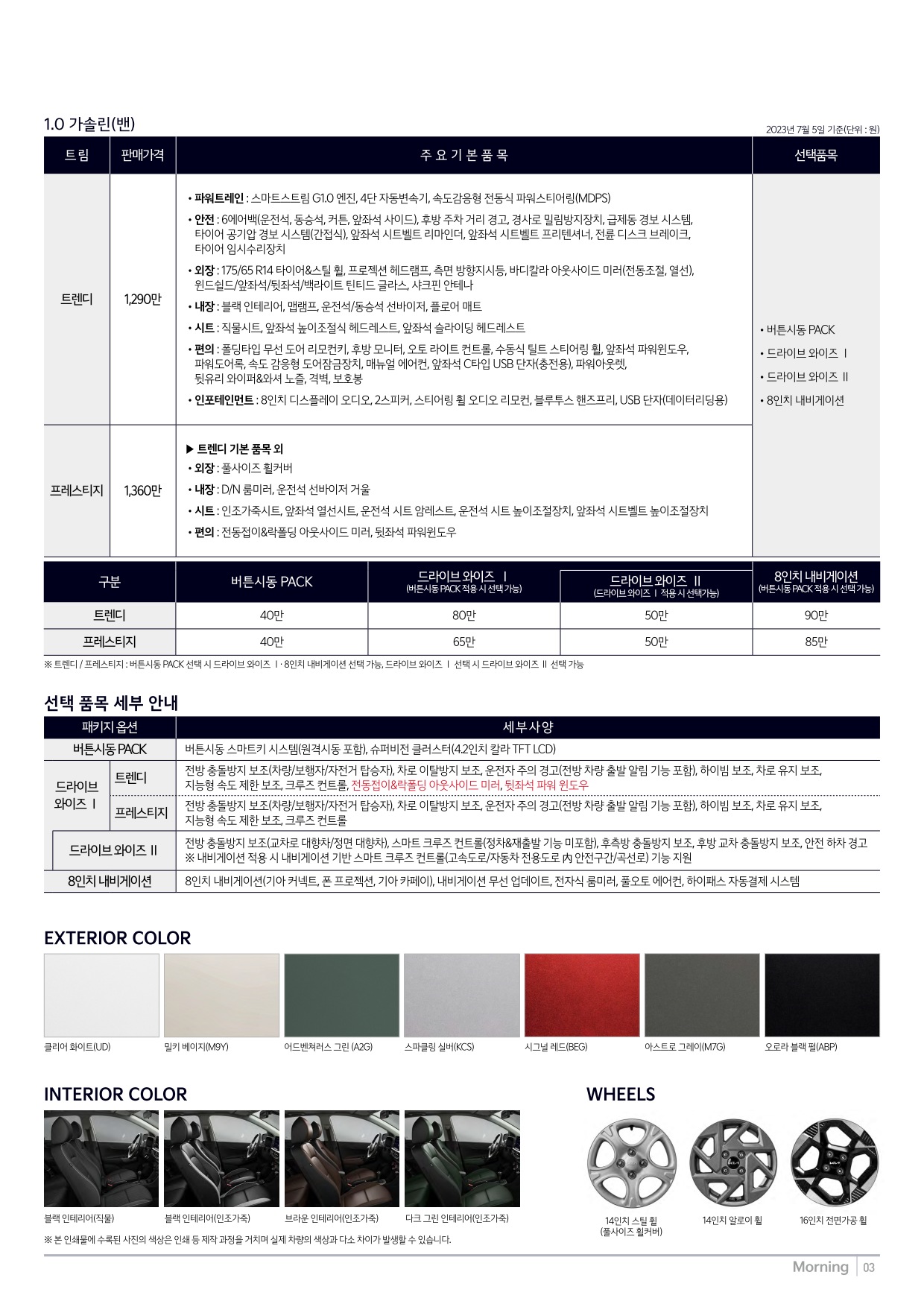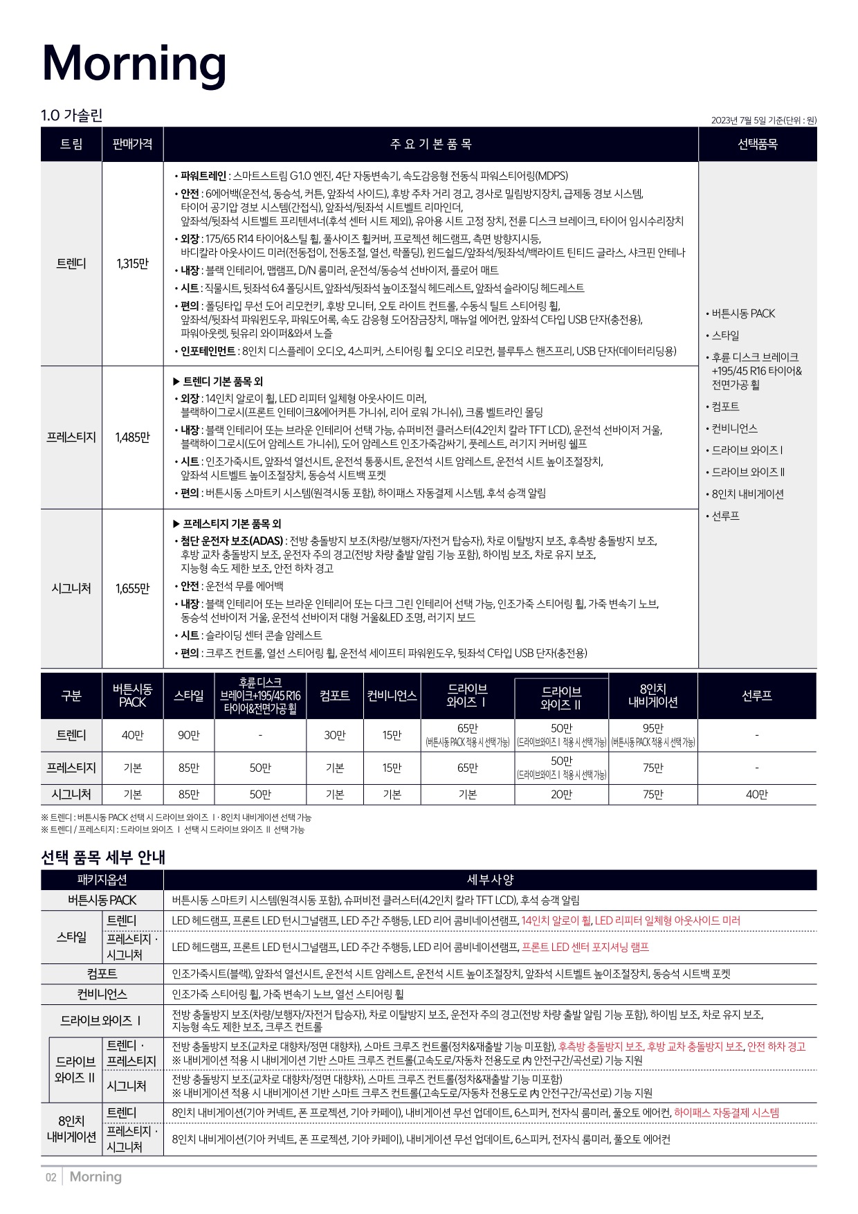 2023년 7월 모닝 신차가격표 (모닝 부분변경 출시)