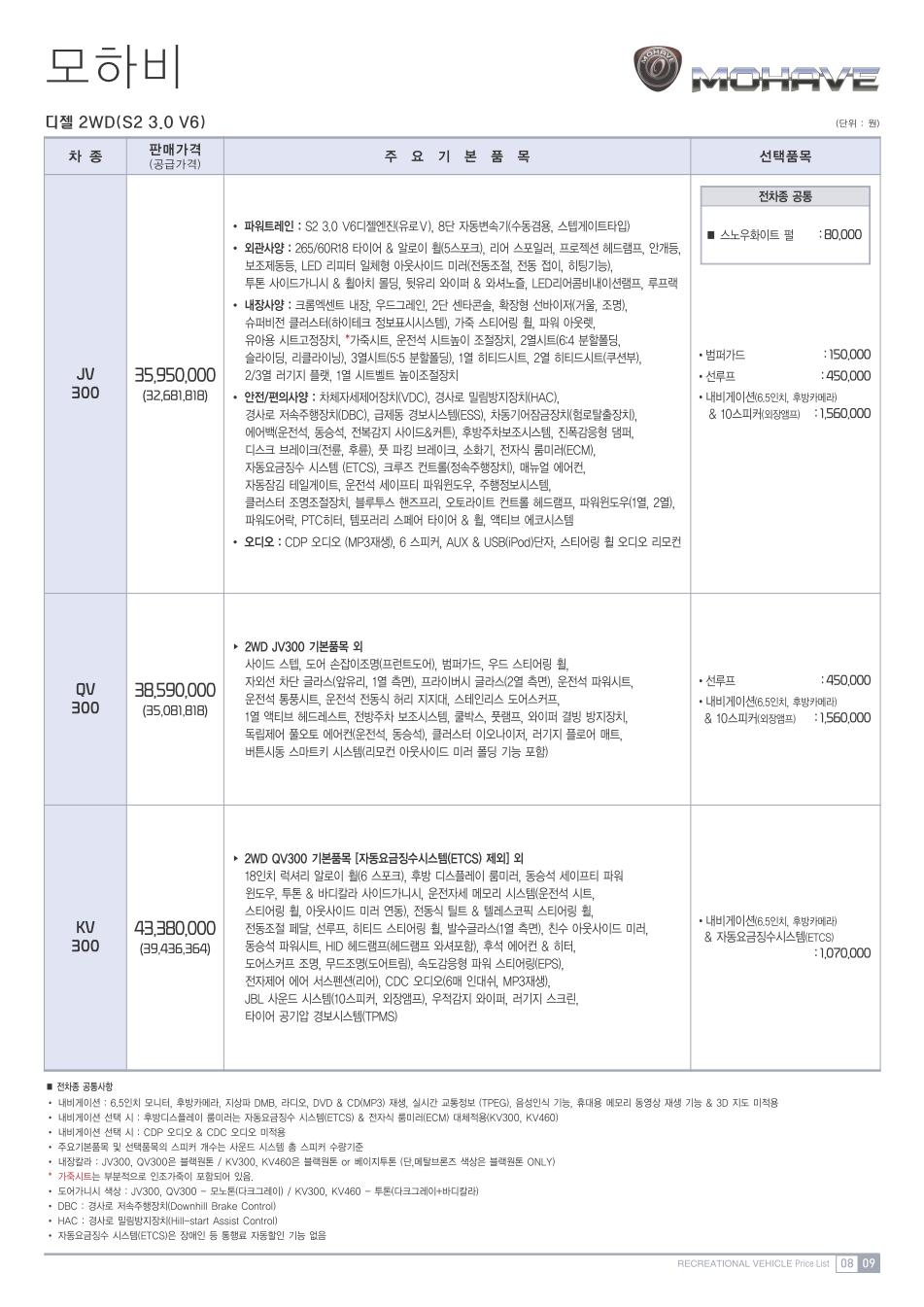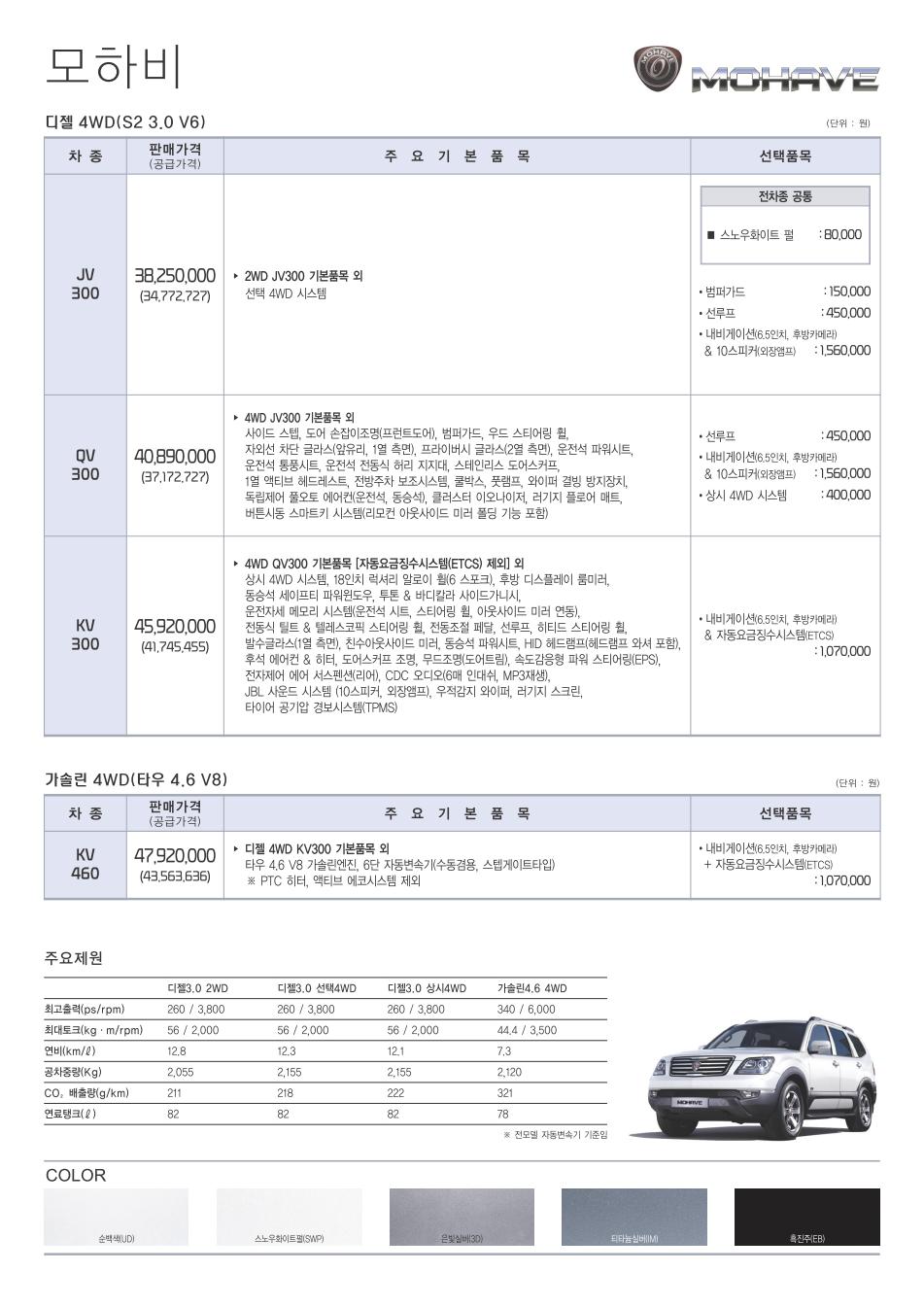 2011년 9월 모하비 신차가격표 (8단미션 적용)