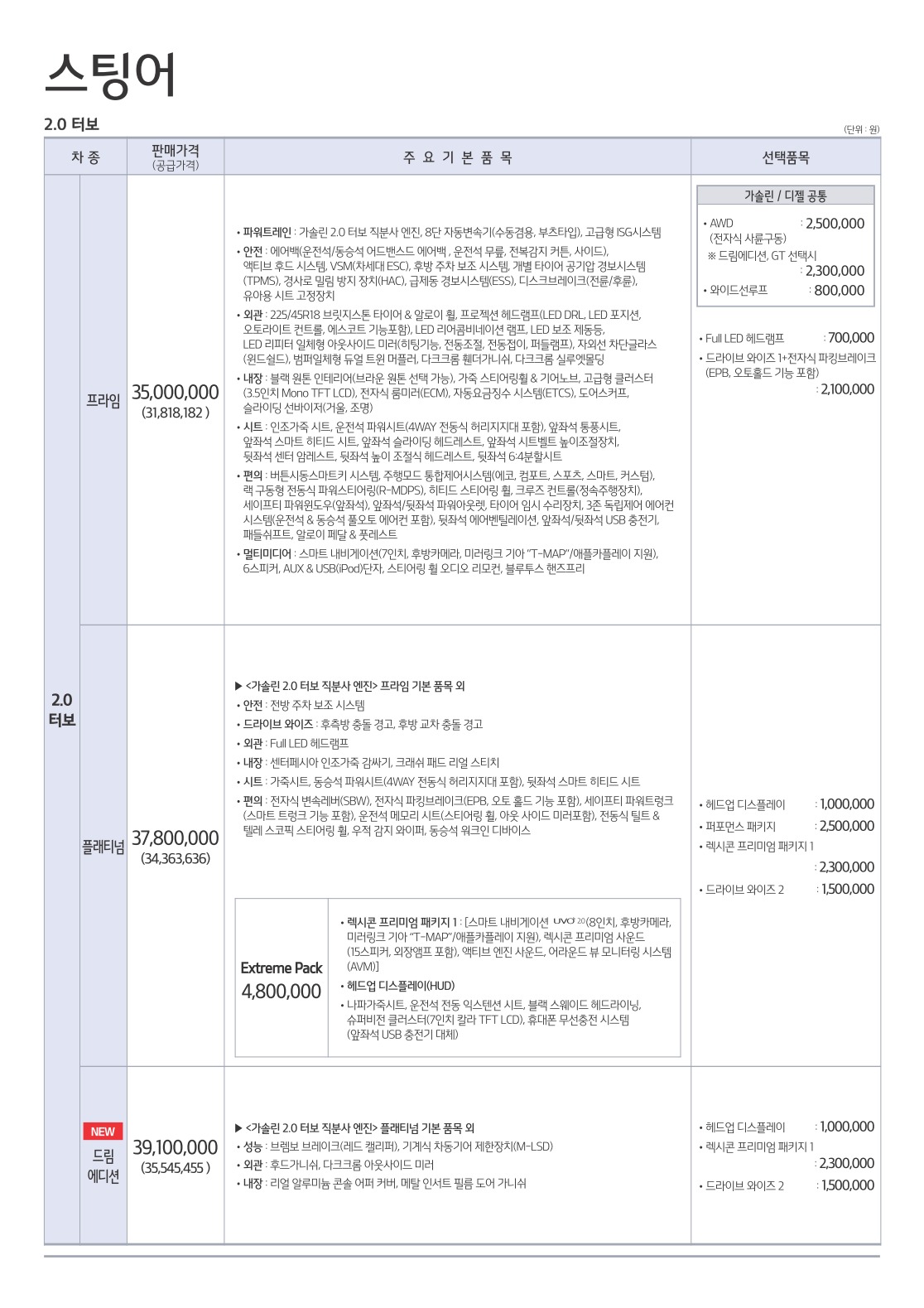 2018년 1월 스팅어 신차가격표