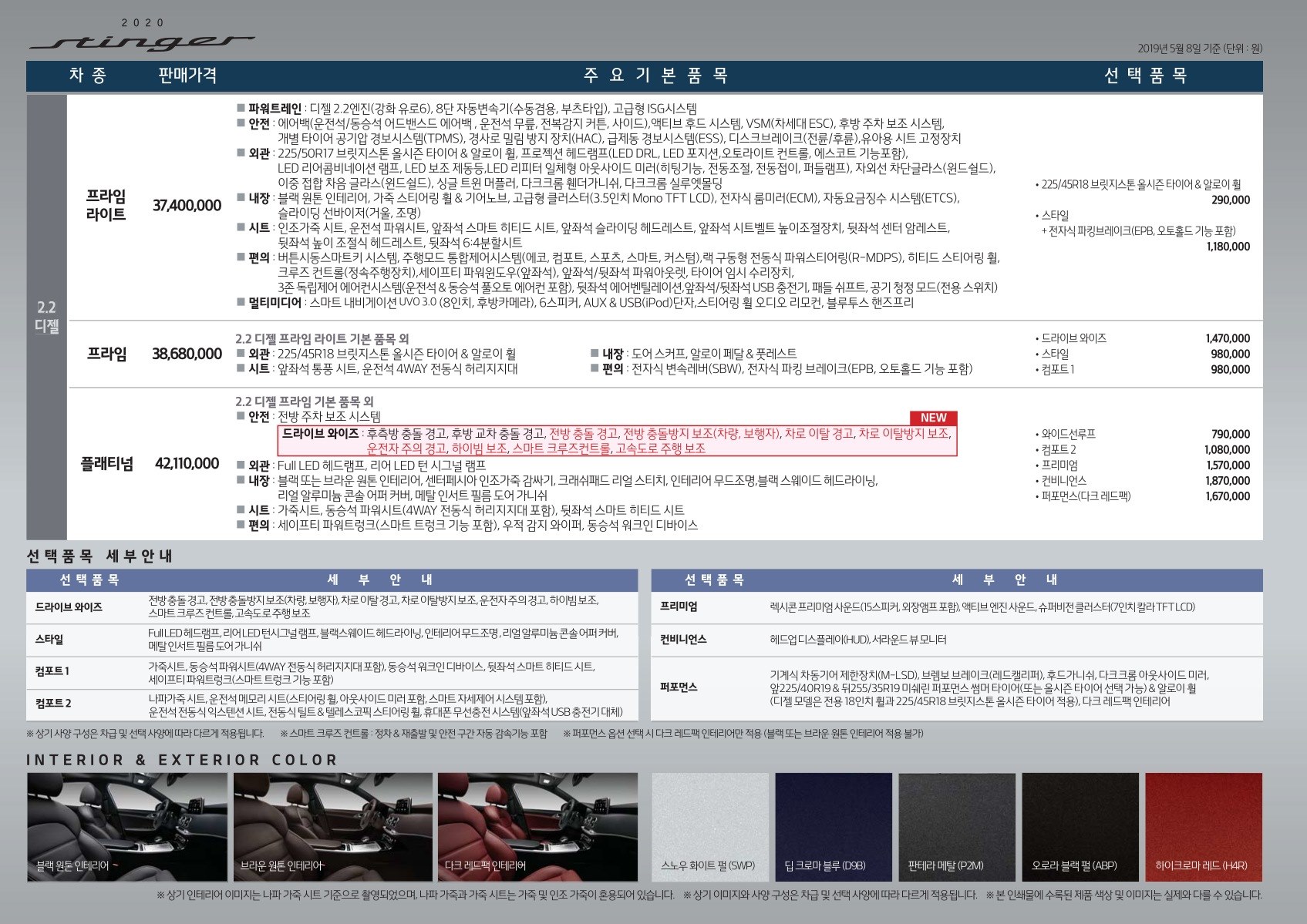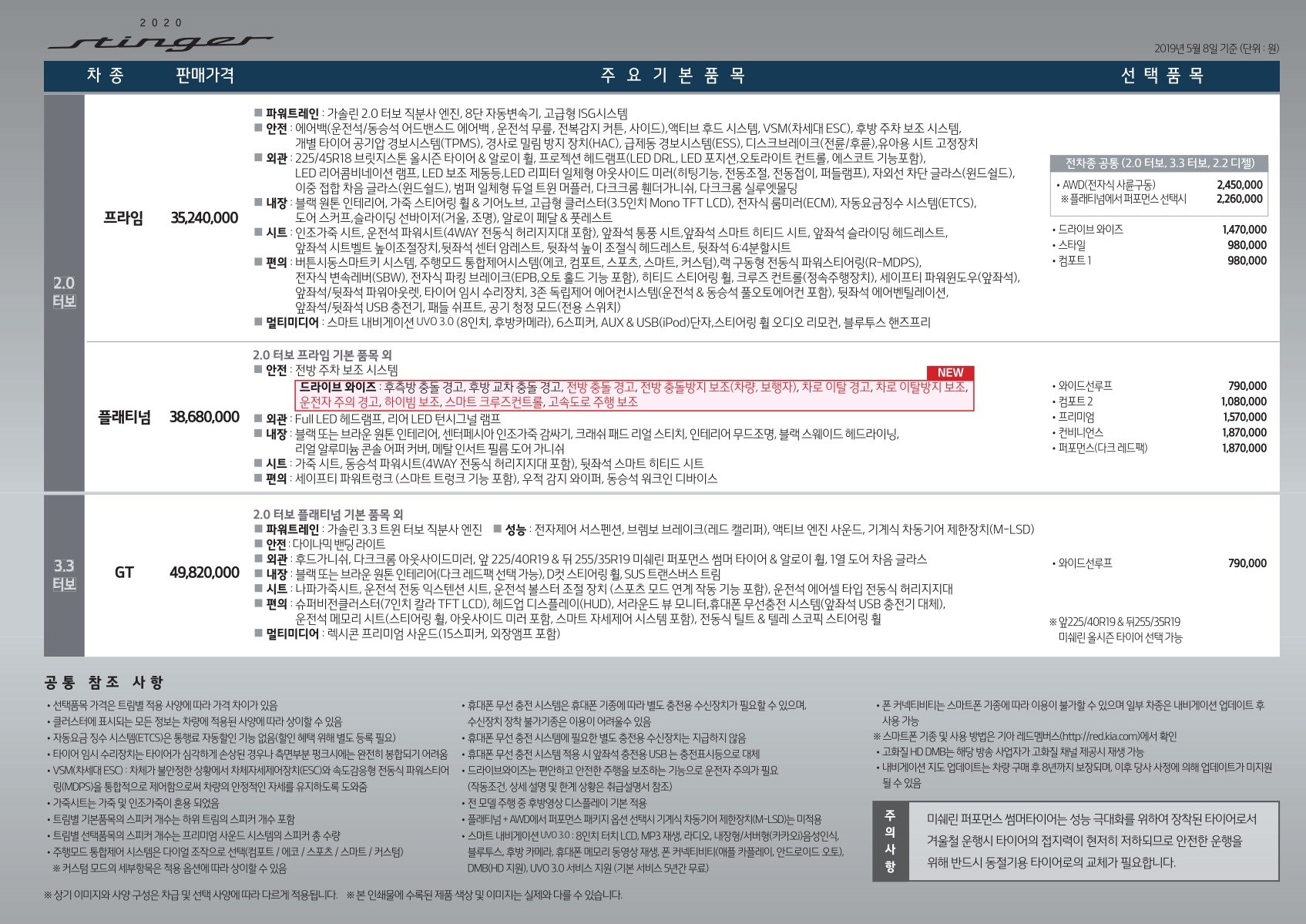 2020년형 스팅어 출시 . 신차 가격표 입니다.
