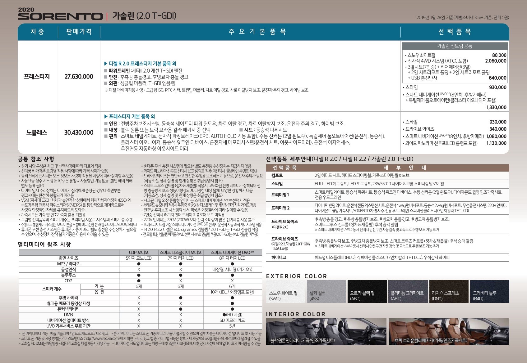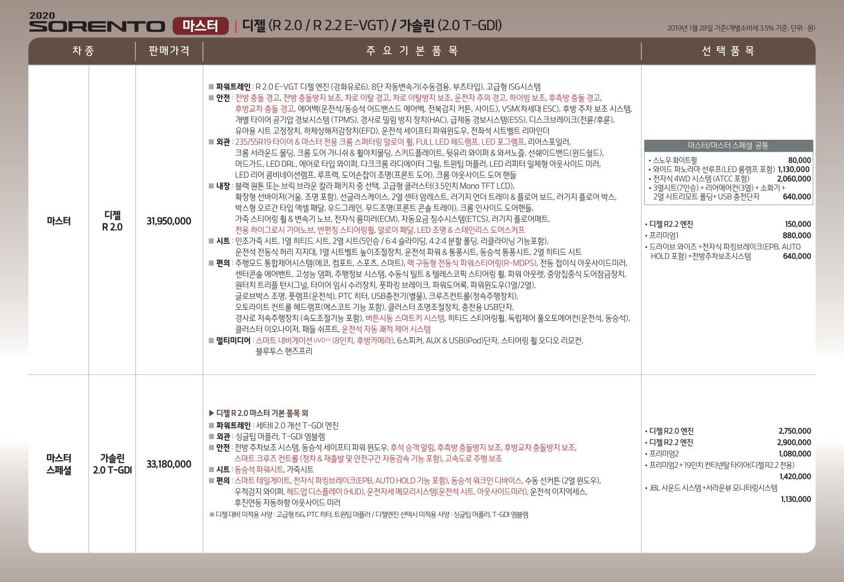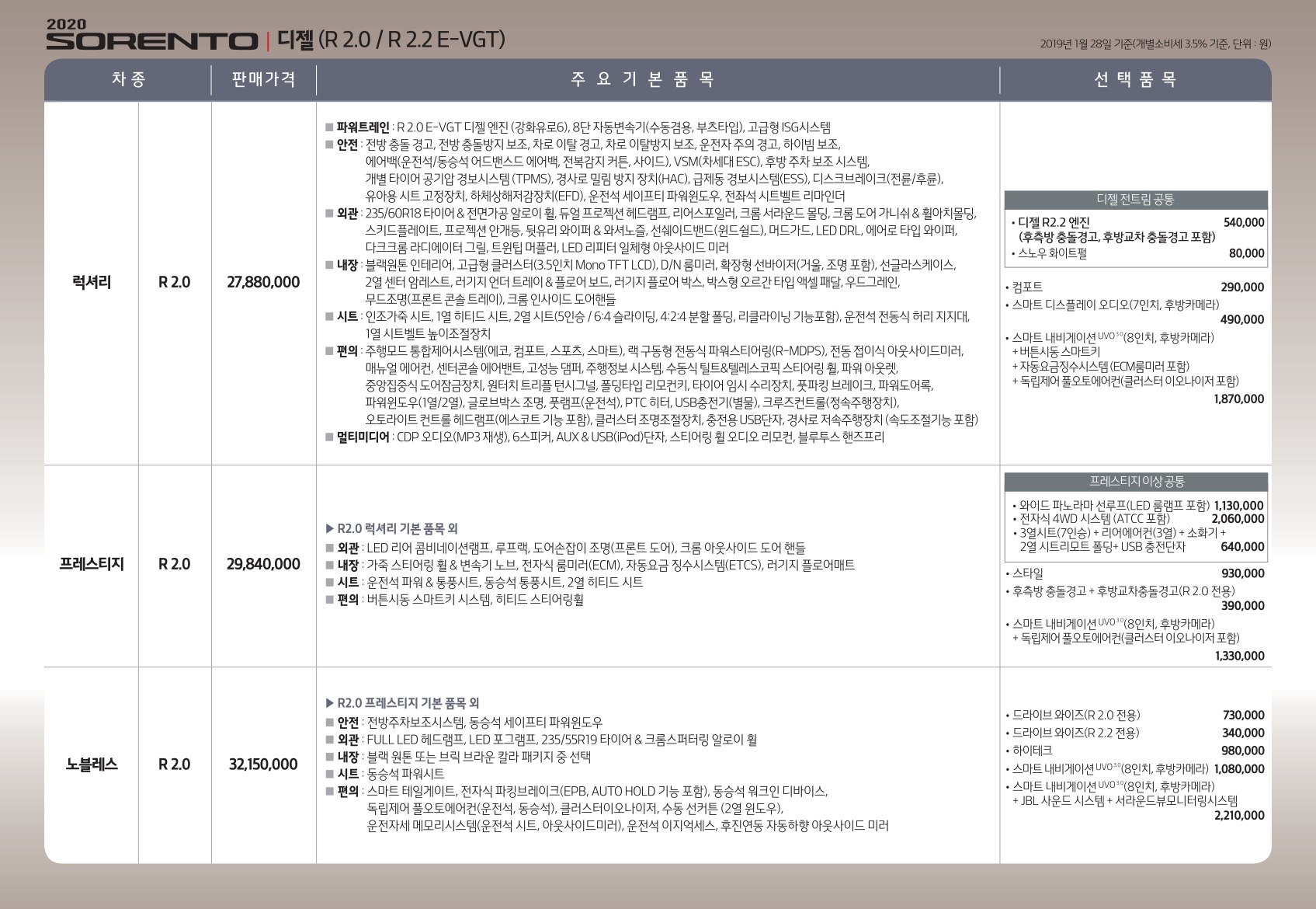 2019년 1월 쏘렌토 신차가격표