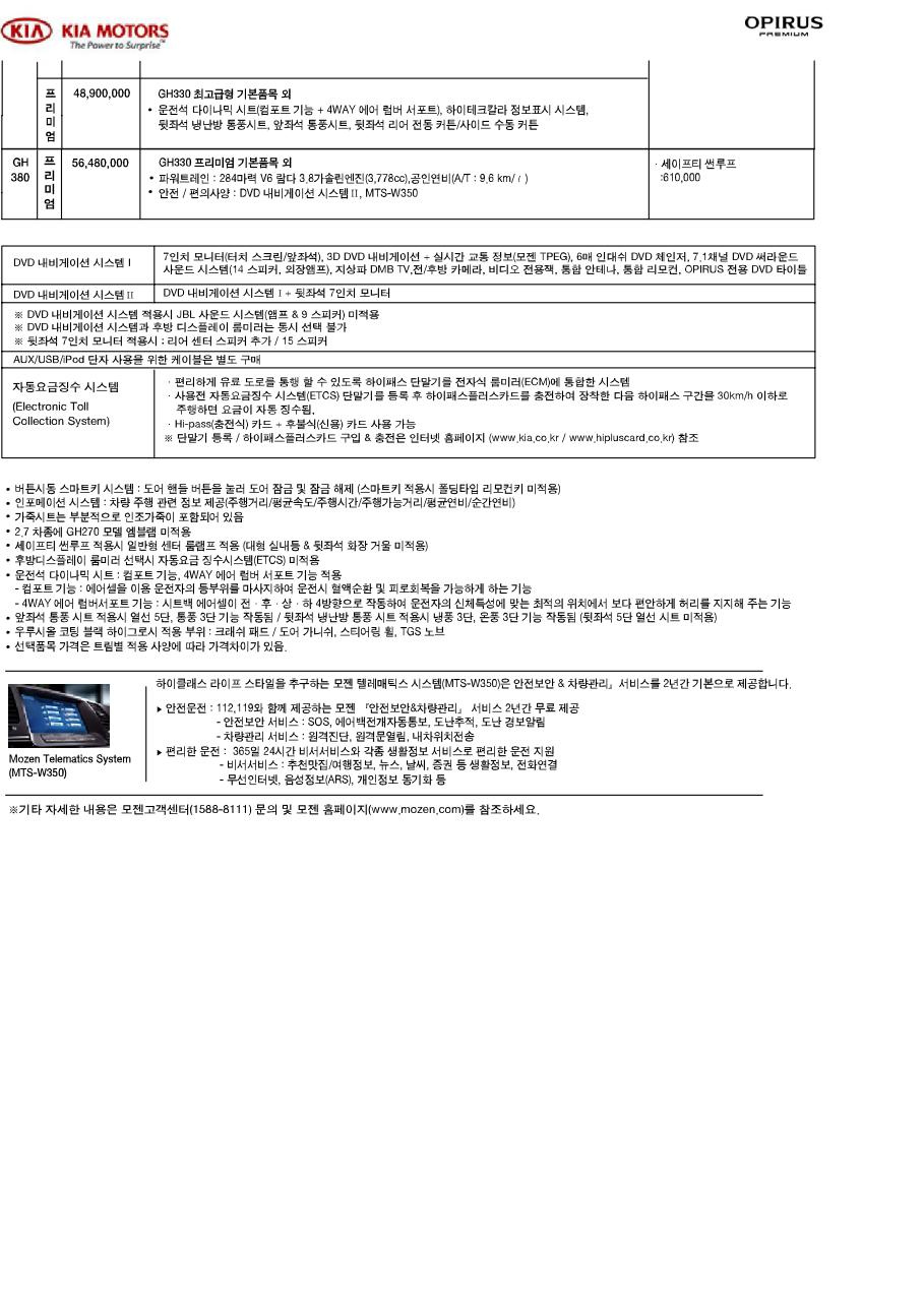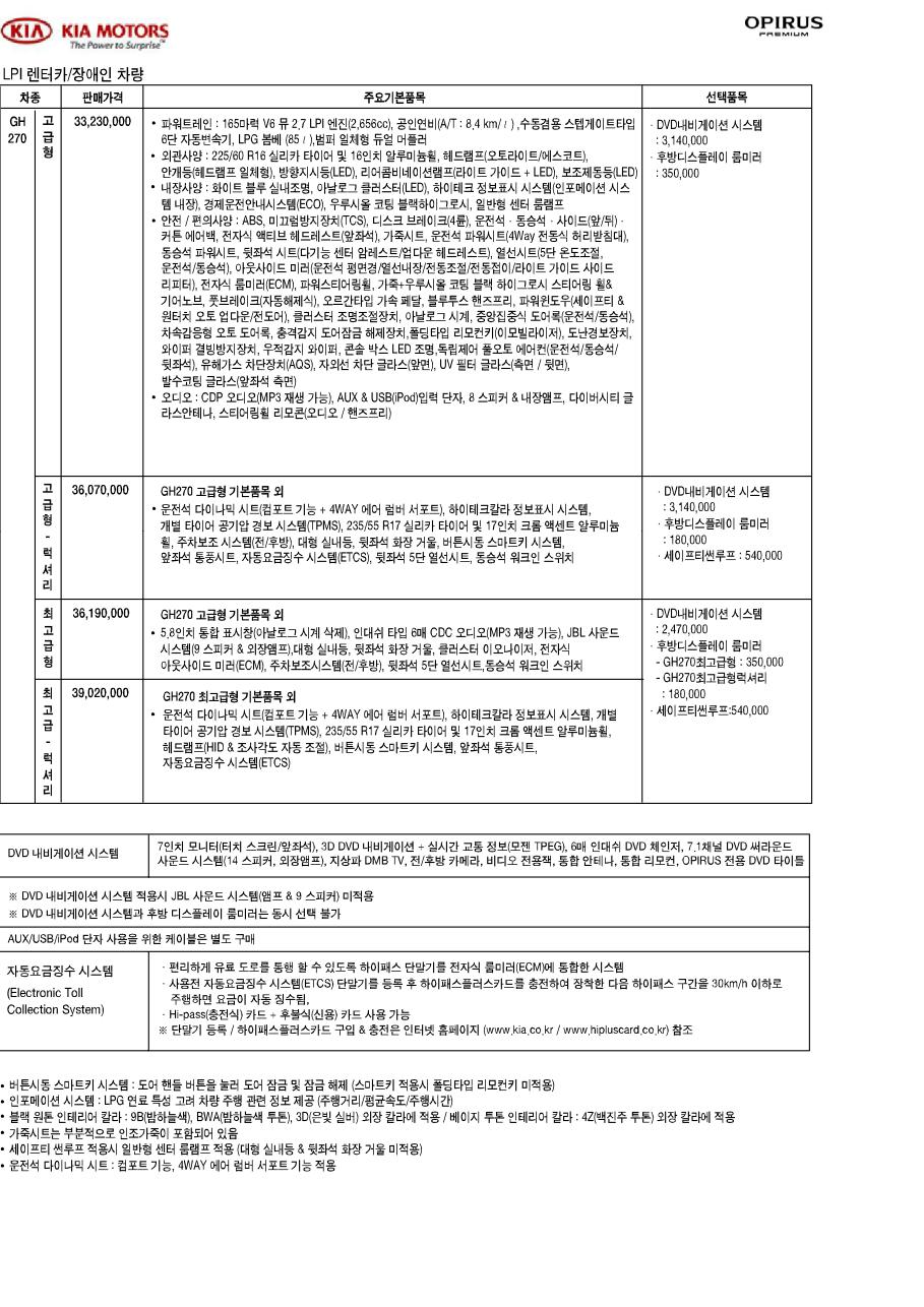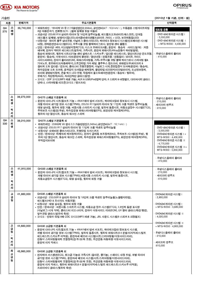 2010년 10월 오피러스 신차가격표 (2011년형)