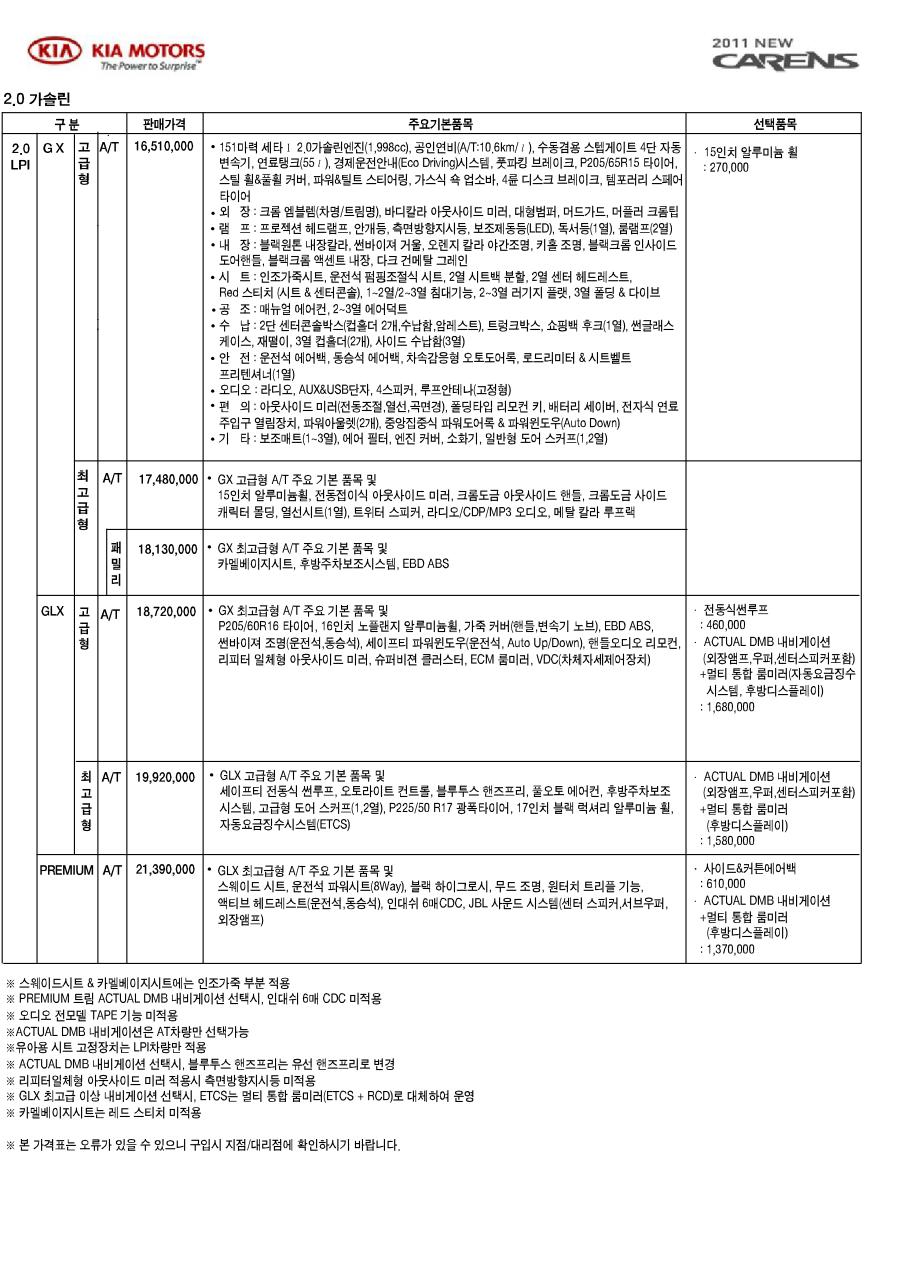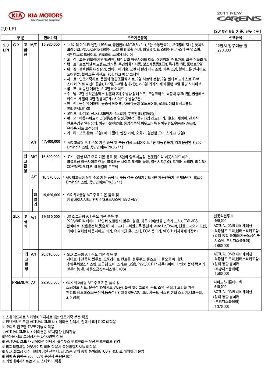 2010년 6월 뉴카렌스 신차가격표 (2011년형)