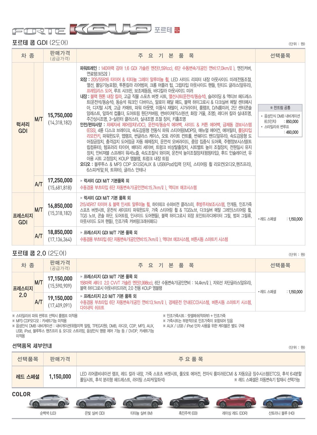 2010년 9월 포르테쿱 신차가격표 (GDi 출시)