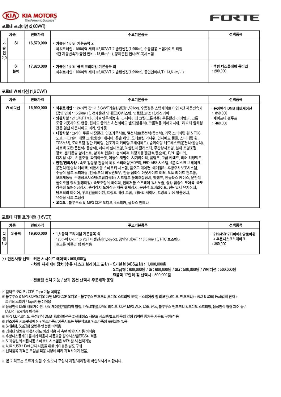 2010년 9월 포르테 신차가격표 (포르테 GDi 출시)