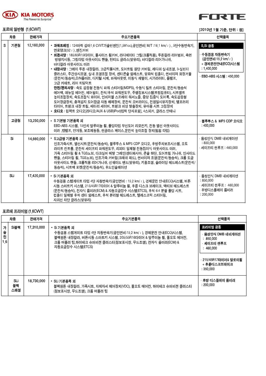 2010년 2월 포르테 신차가격표