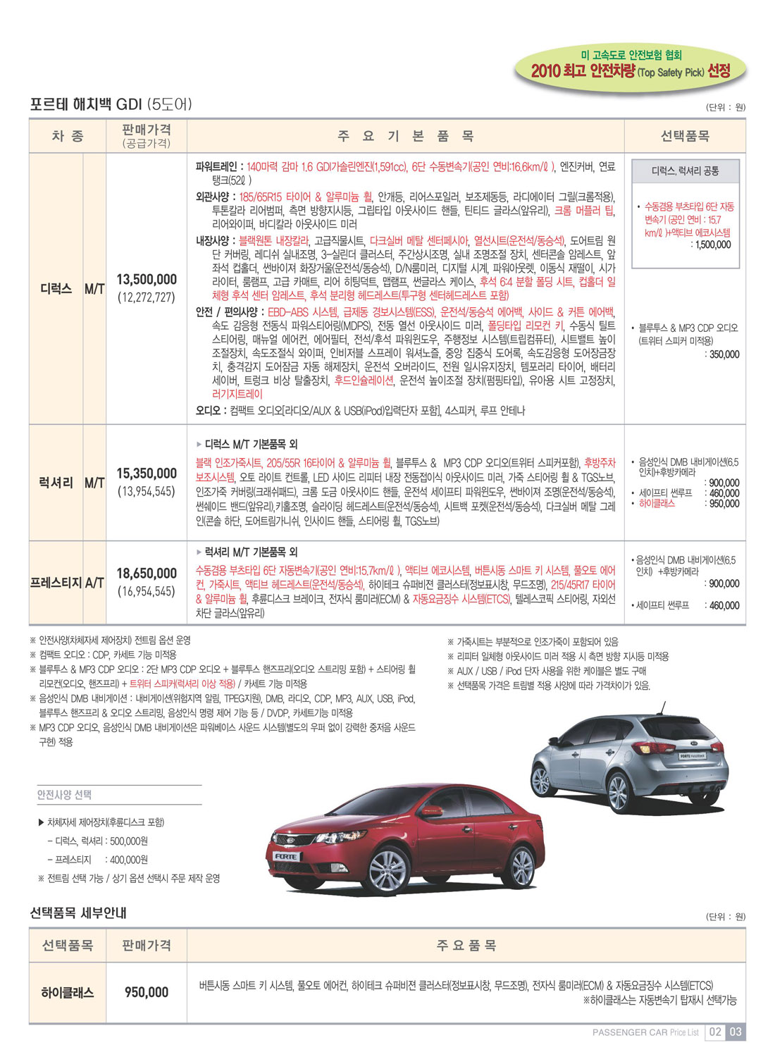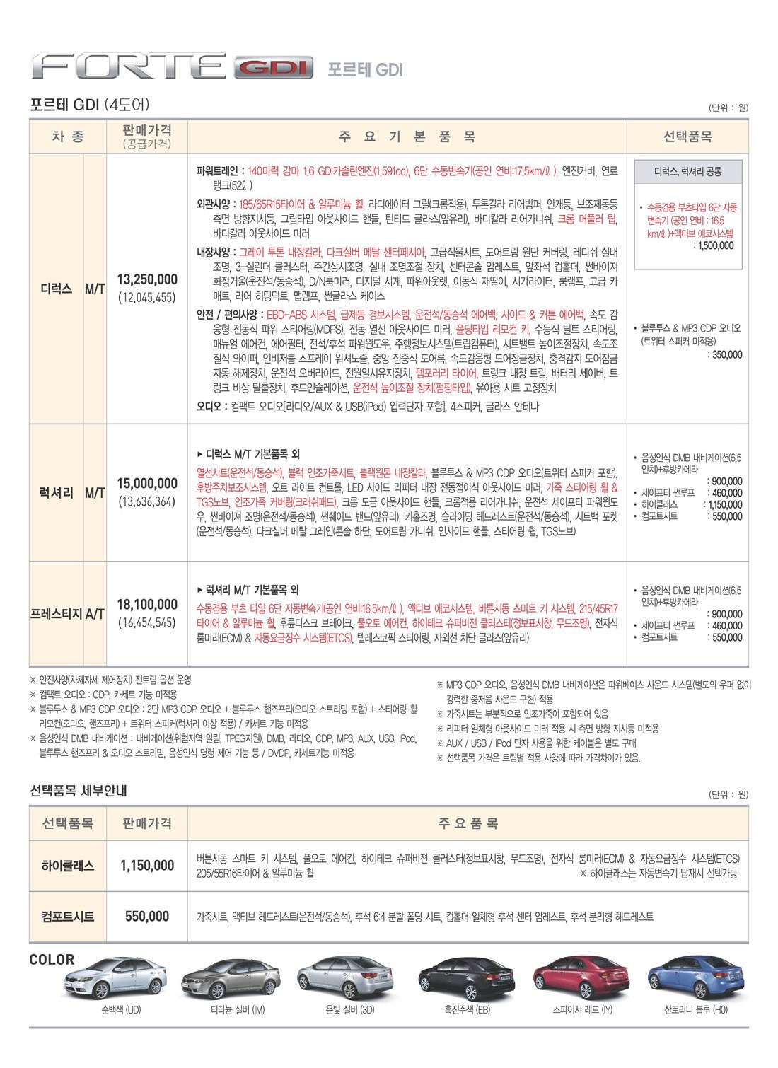 2010년 9월 포르테 신차가격표 (포르테 GDi 출시)