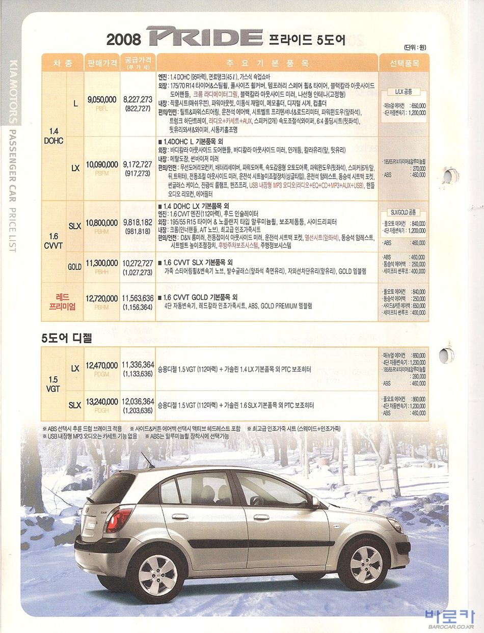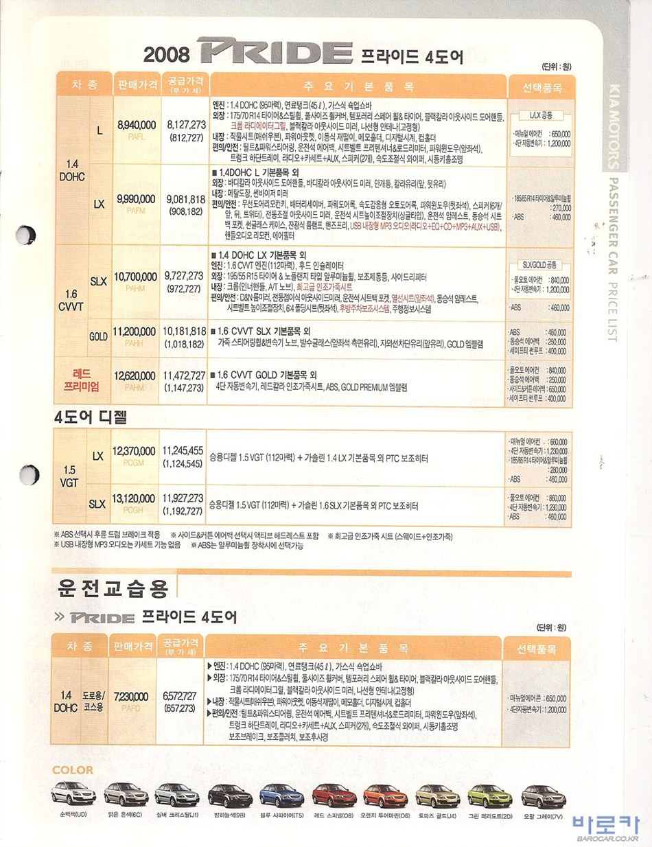 2008년 1월 뉴프라이드(JB) 신차가격표