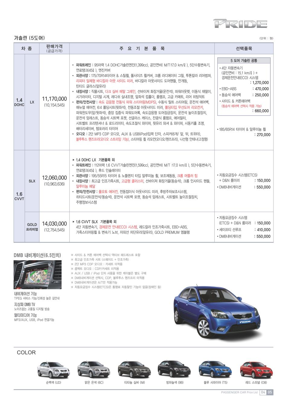 2010년 12월 뉴프라이드(JB) 신차가격표