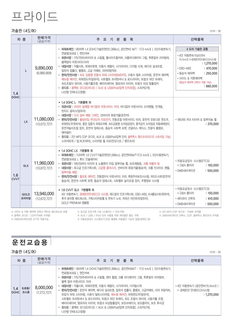 2011년 9월 올뉴프라이드(UB) 신차가격표