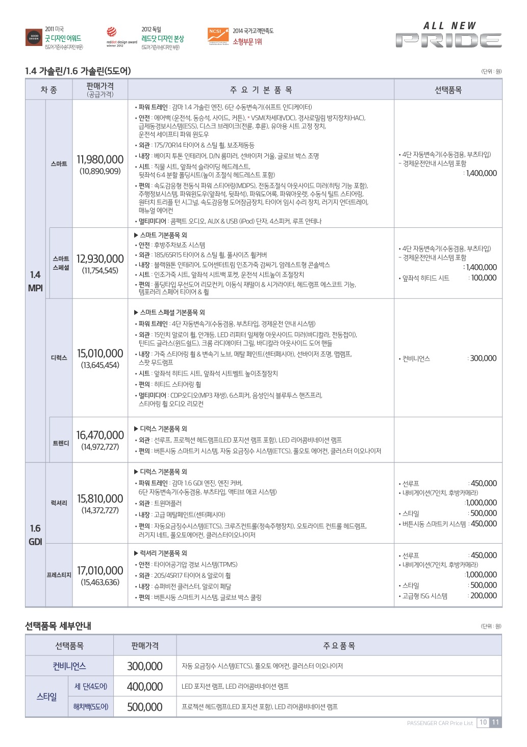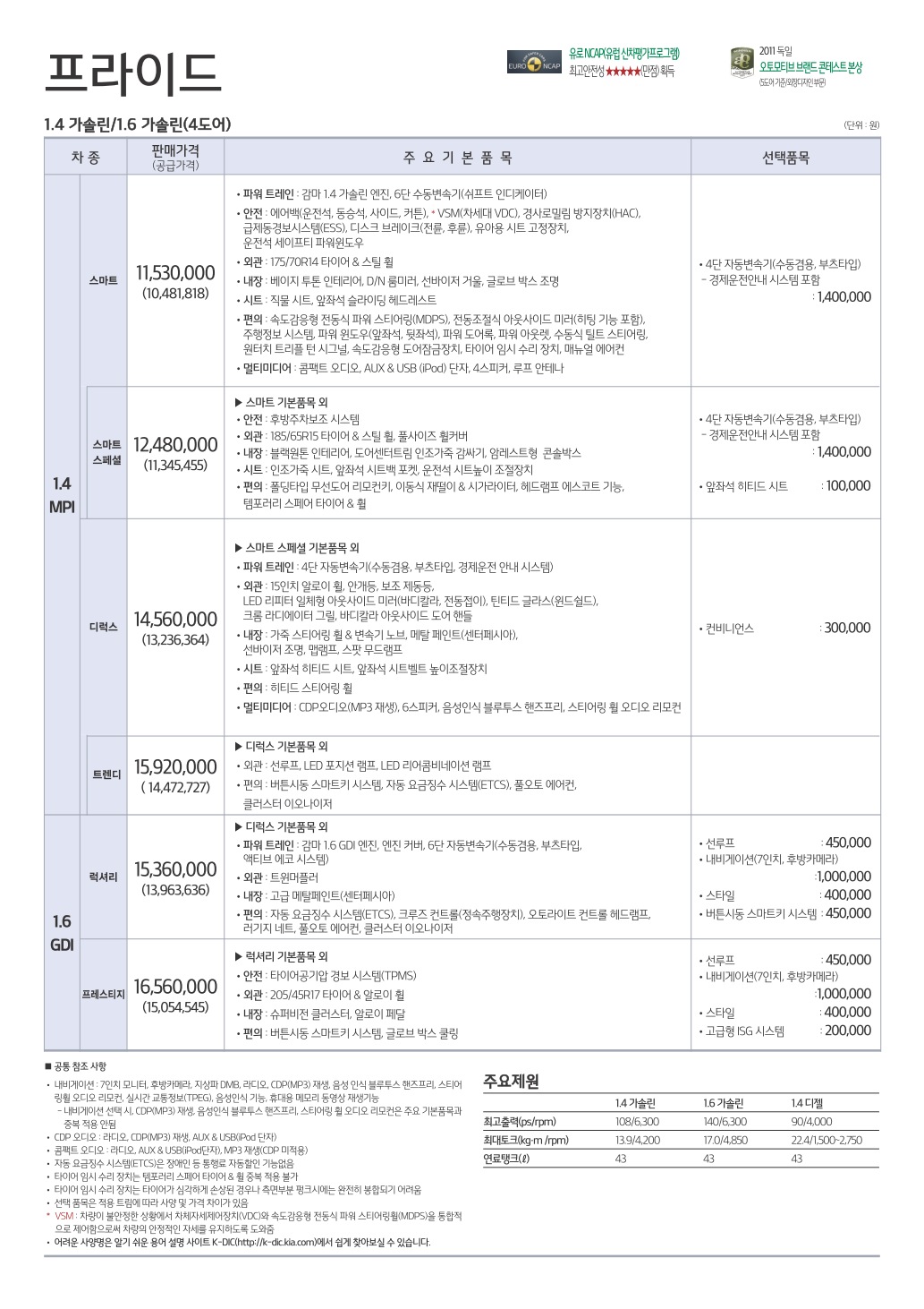 2014년 11월 올뉴프라이드(UB) 신차가격표