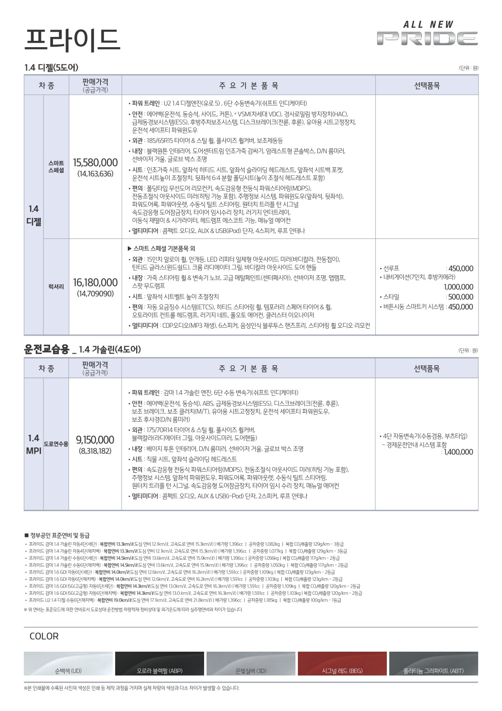 2015년 2월 올뉴프라이드(UB) 신차가격표