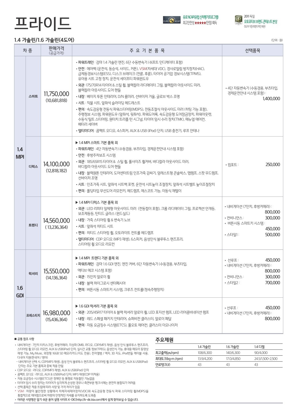 2014년 11월 올뉴프라이드(UB) 신차가격표