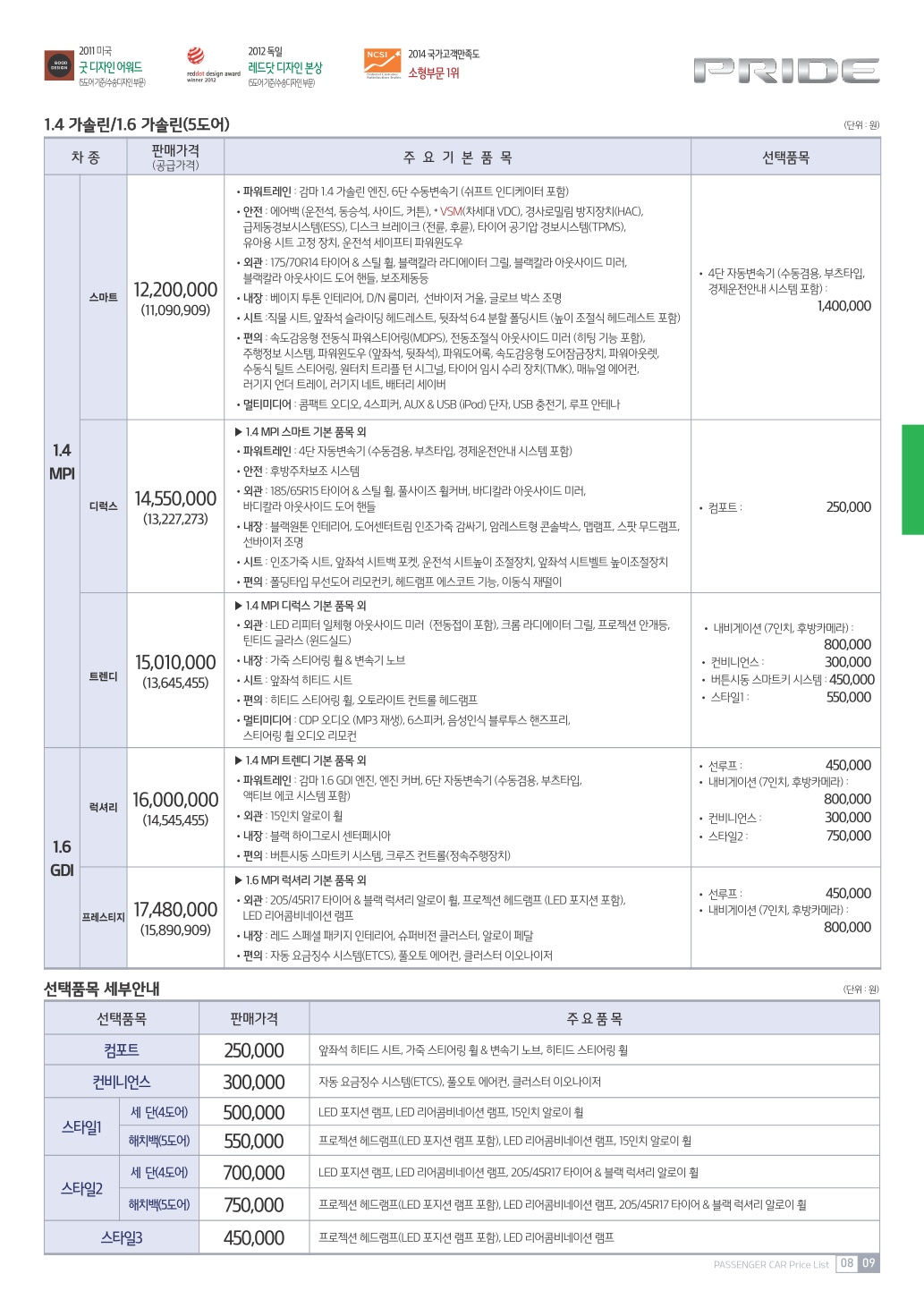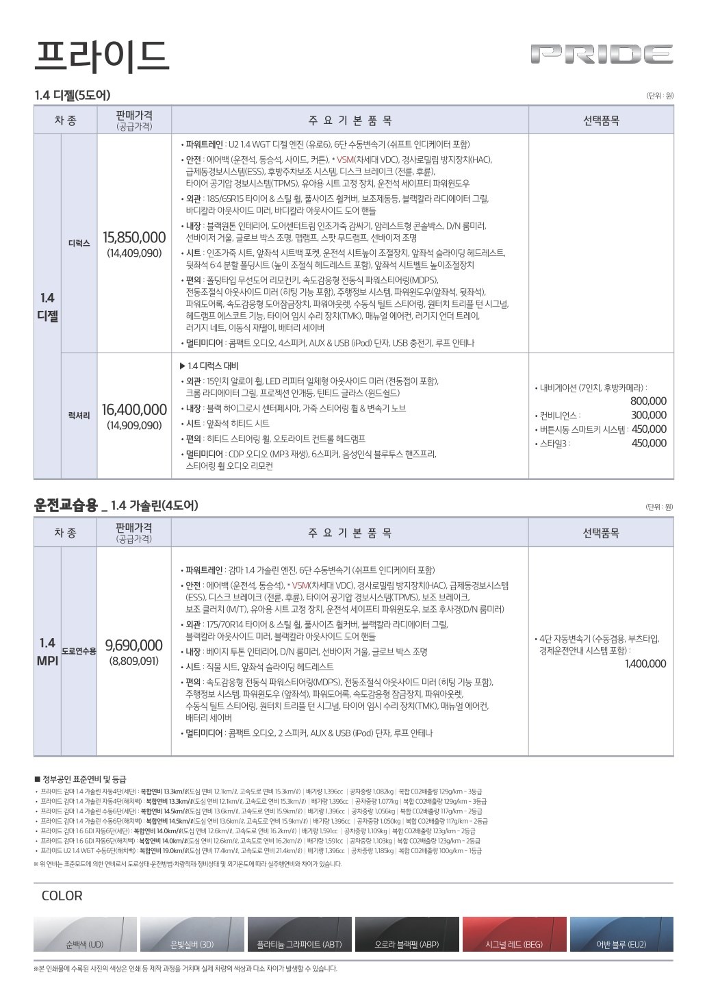 2015년 2월 올뉴프라이드(UB) 신차가격표