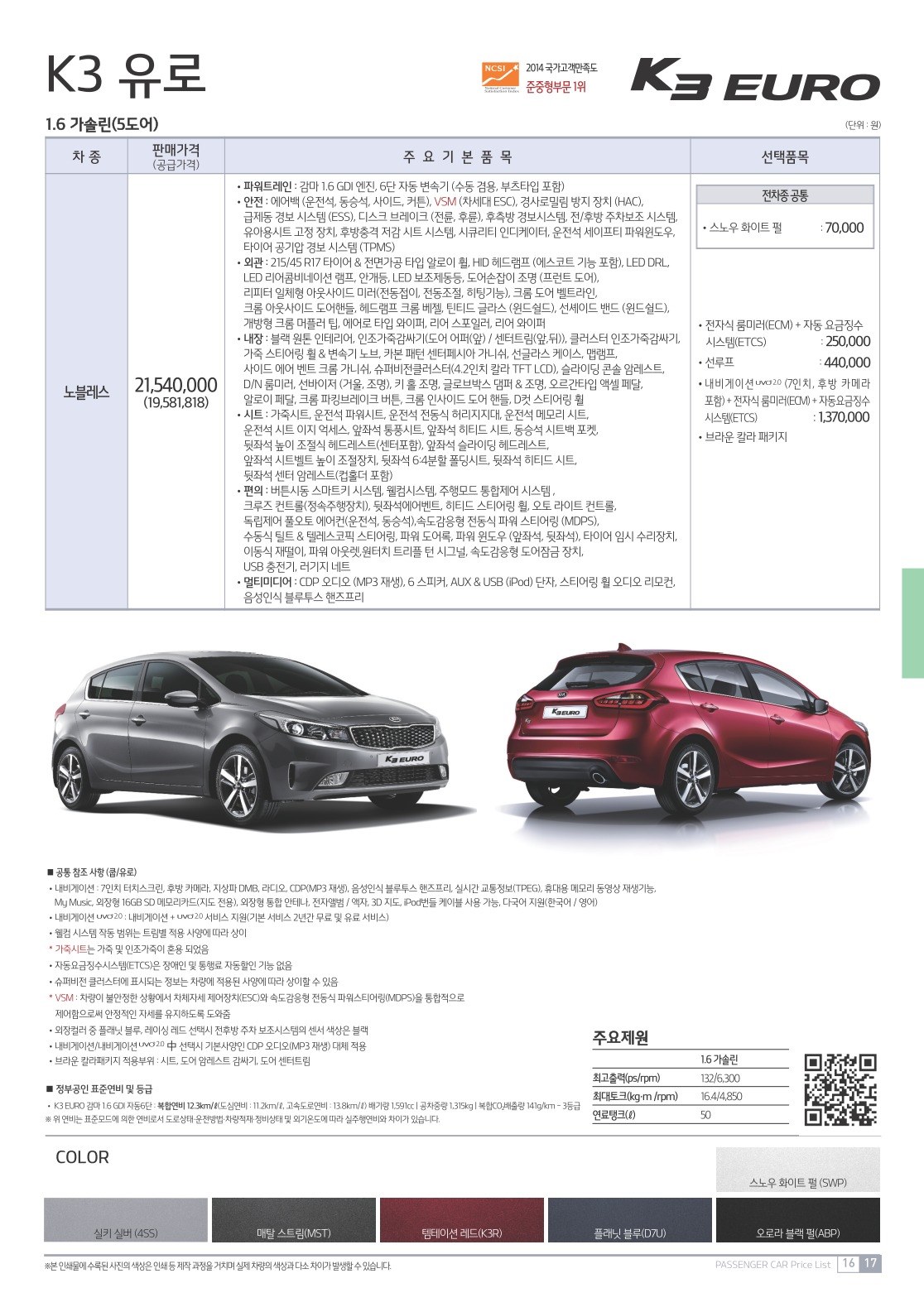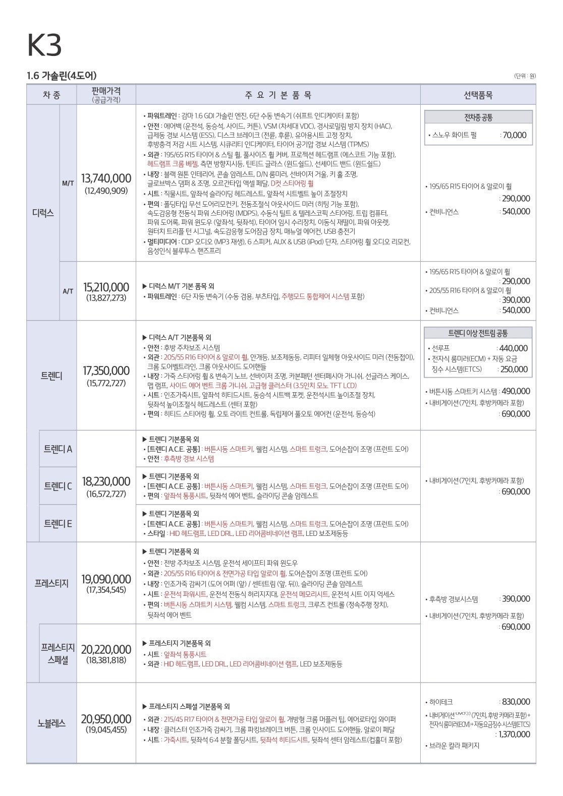 2016년 9월 K3 신차가격표 (K3 세단, K3 유로 신차가격표)