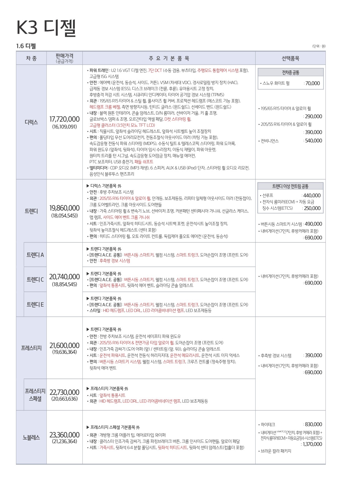 2016년 3월 K3 신차가격표 (K3 세단, K3 유로 신차가격표)