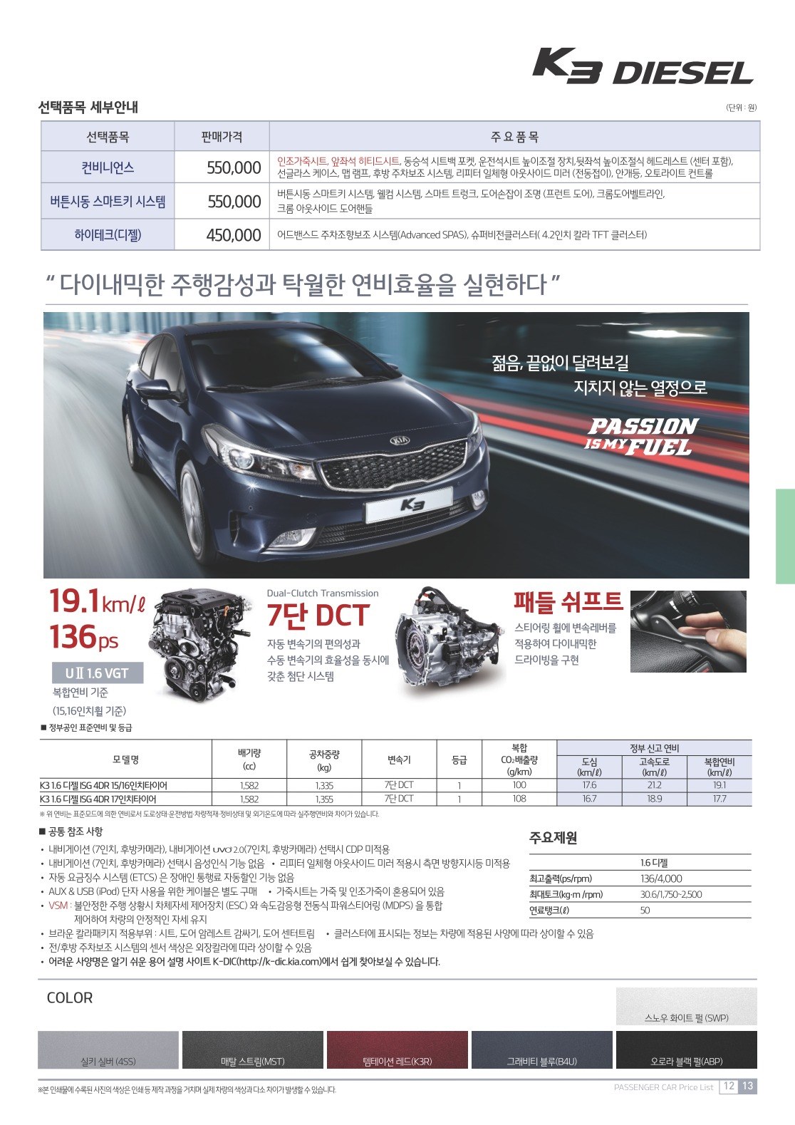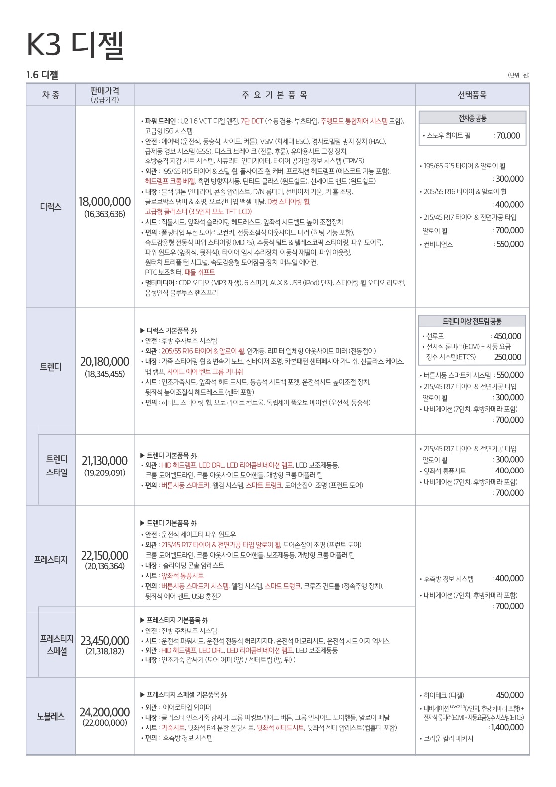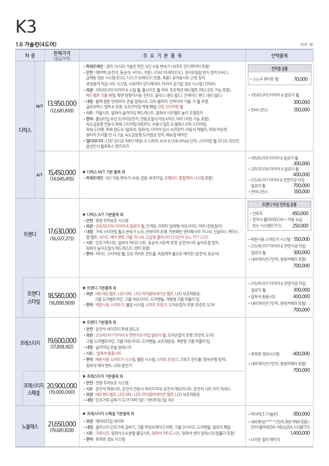 2016년 3월 K3 신차가격표 (K3 세단, K3 유로 신차가격표)