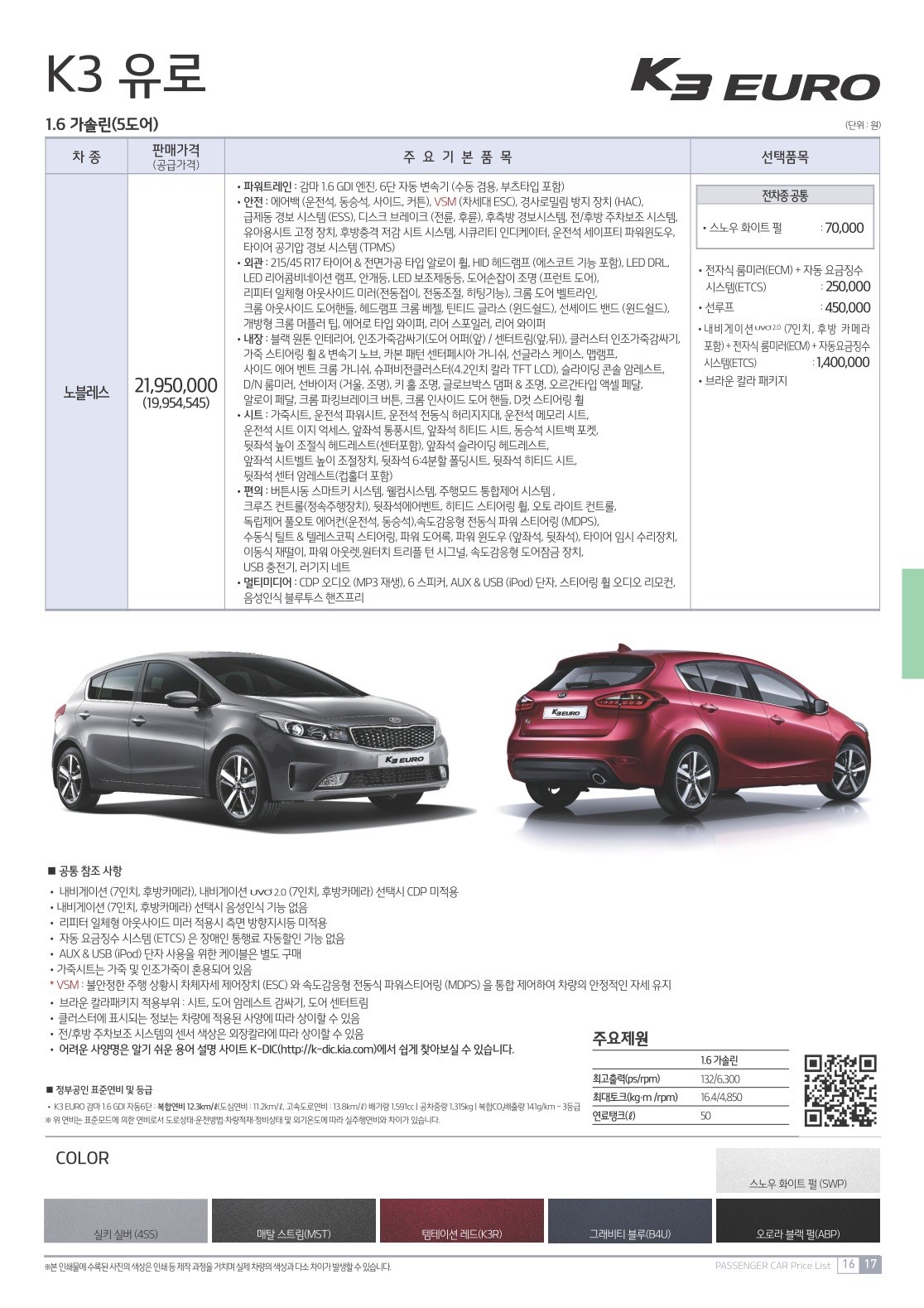 2016년 9월 K3 신차가격표 (K3 세단, K3 유로 신차가격표)