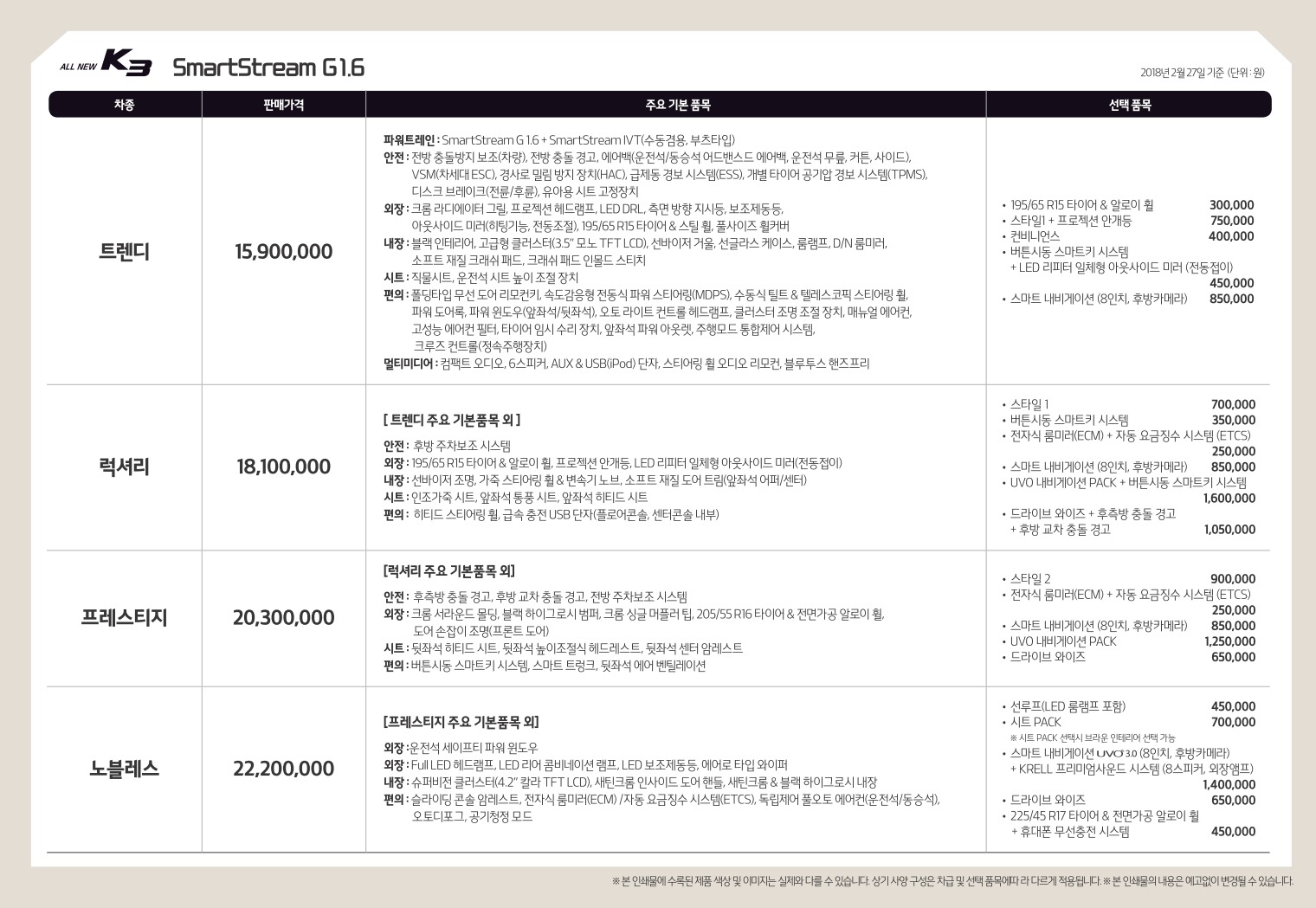 2018년 2월 K3 신차가격표 (올뉴 K3)