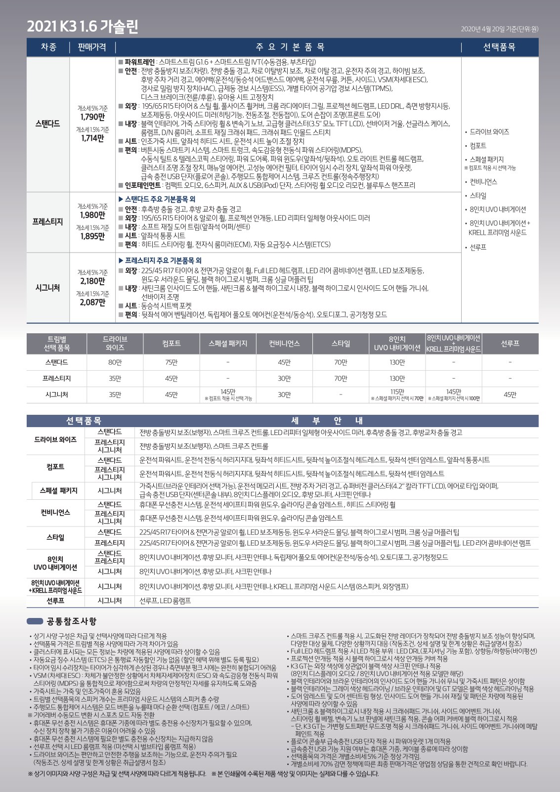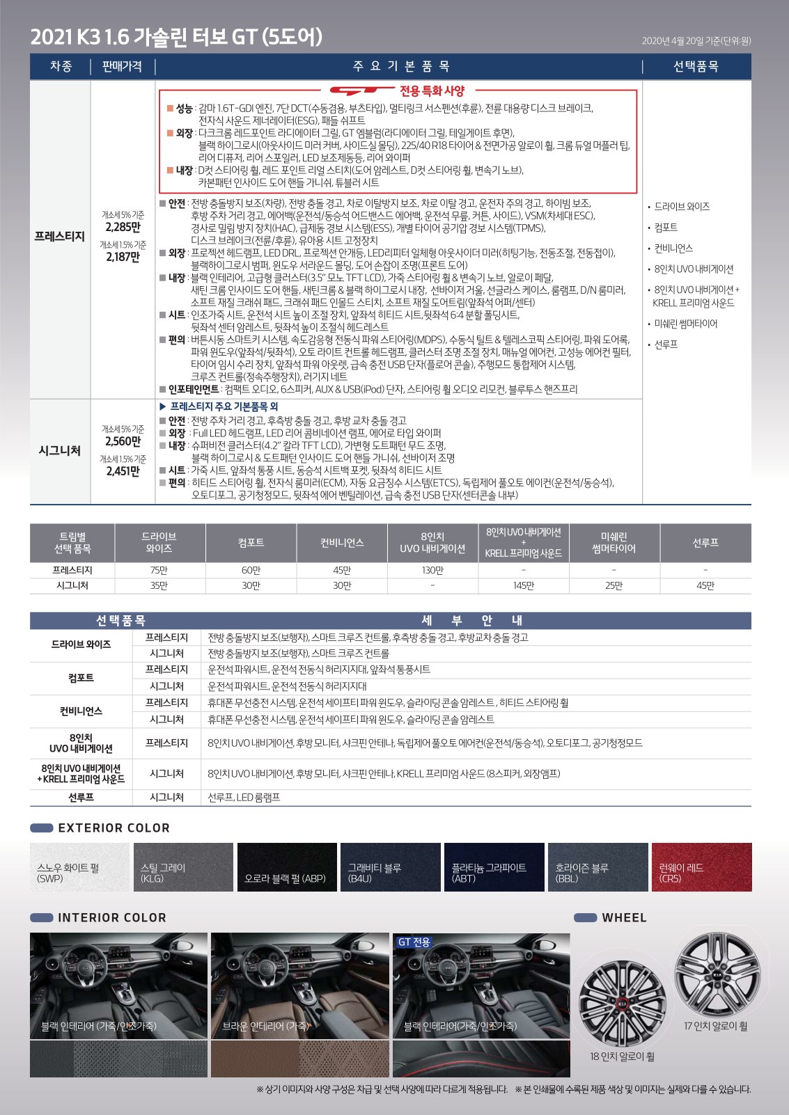 2020년 4월 K3 / K3 GT 신차가격표 (2021년형 출시)