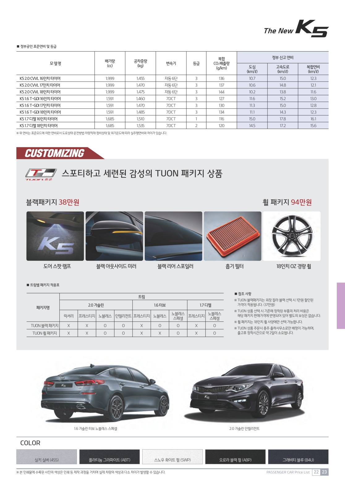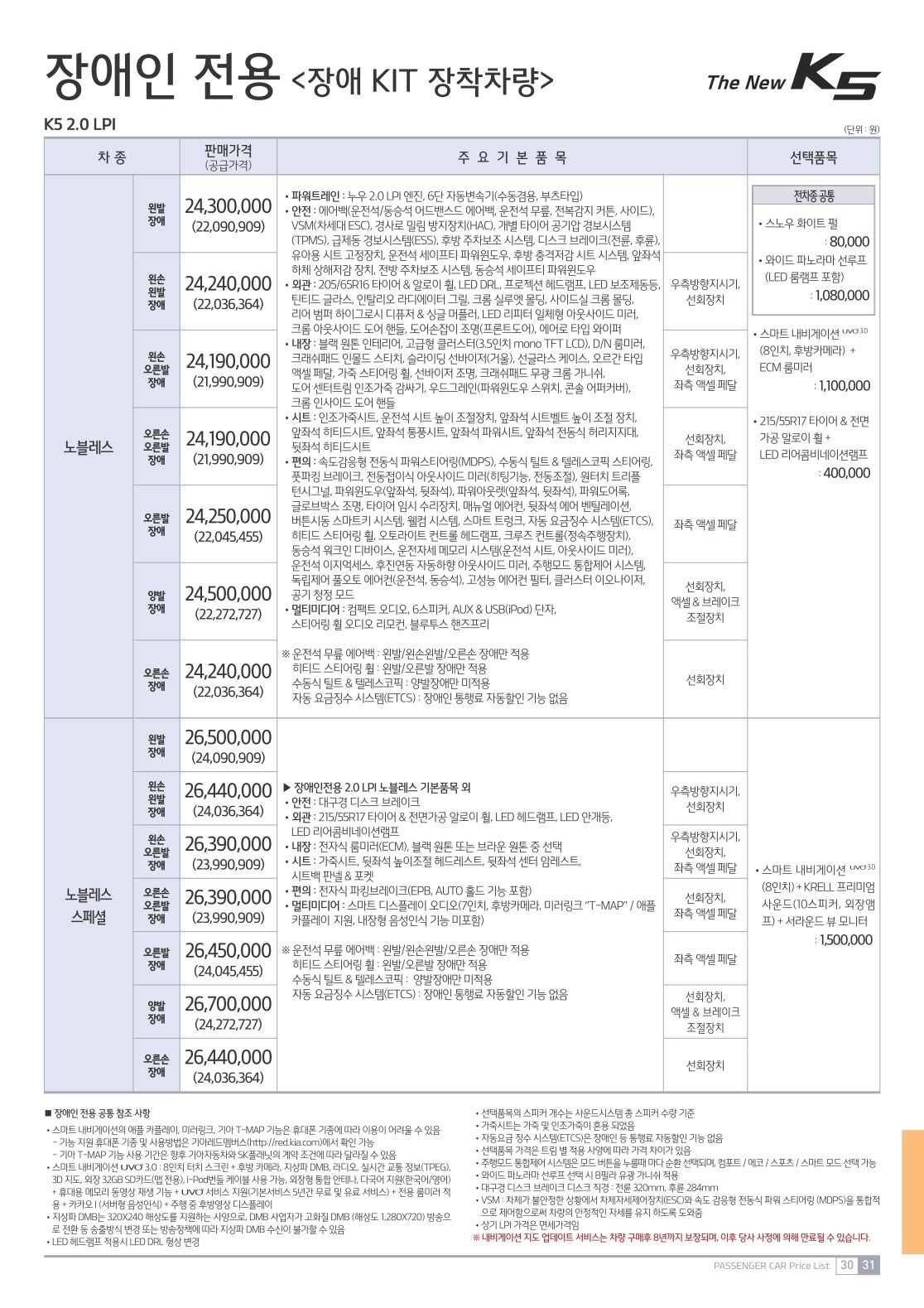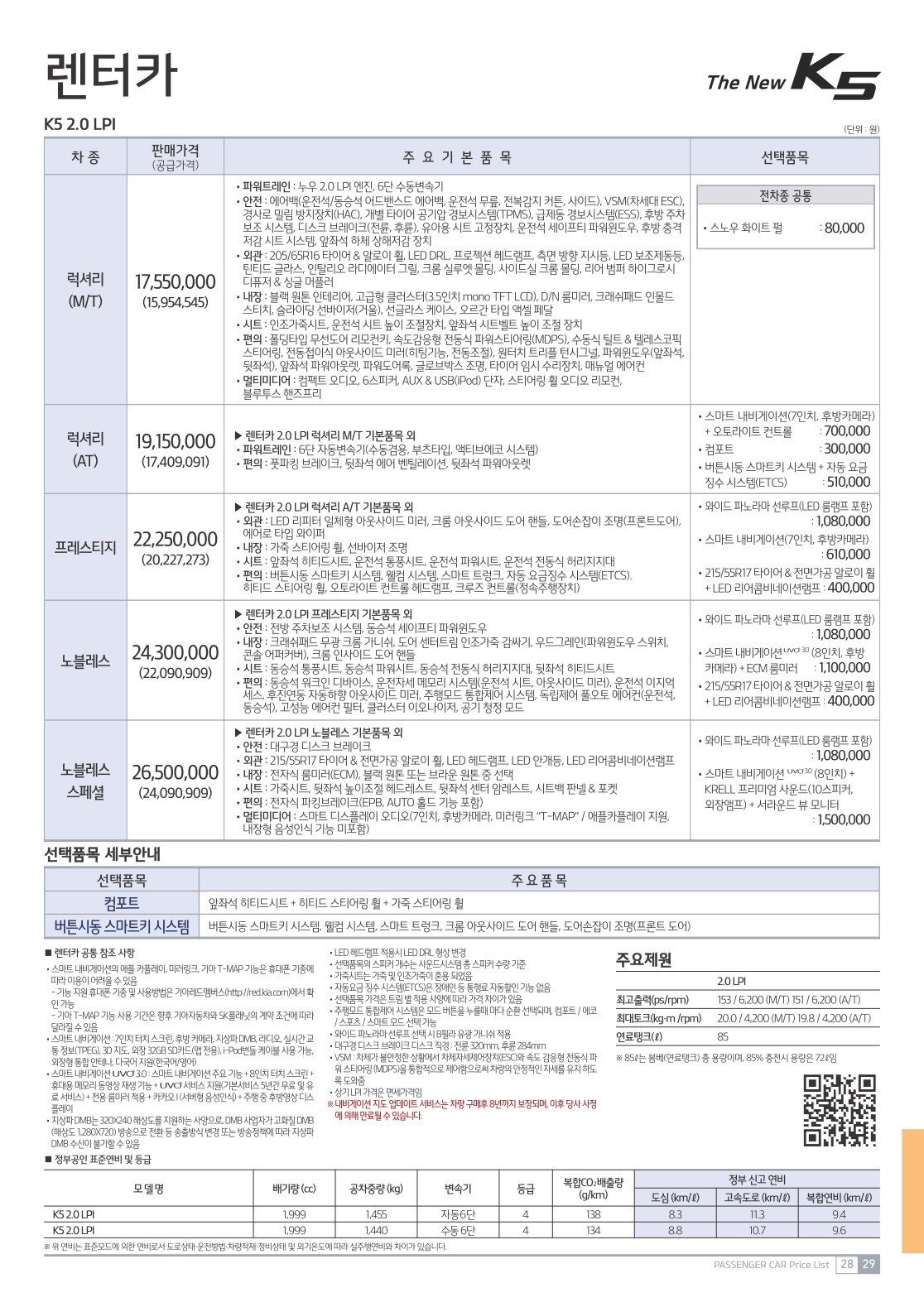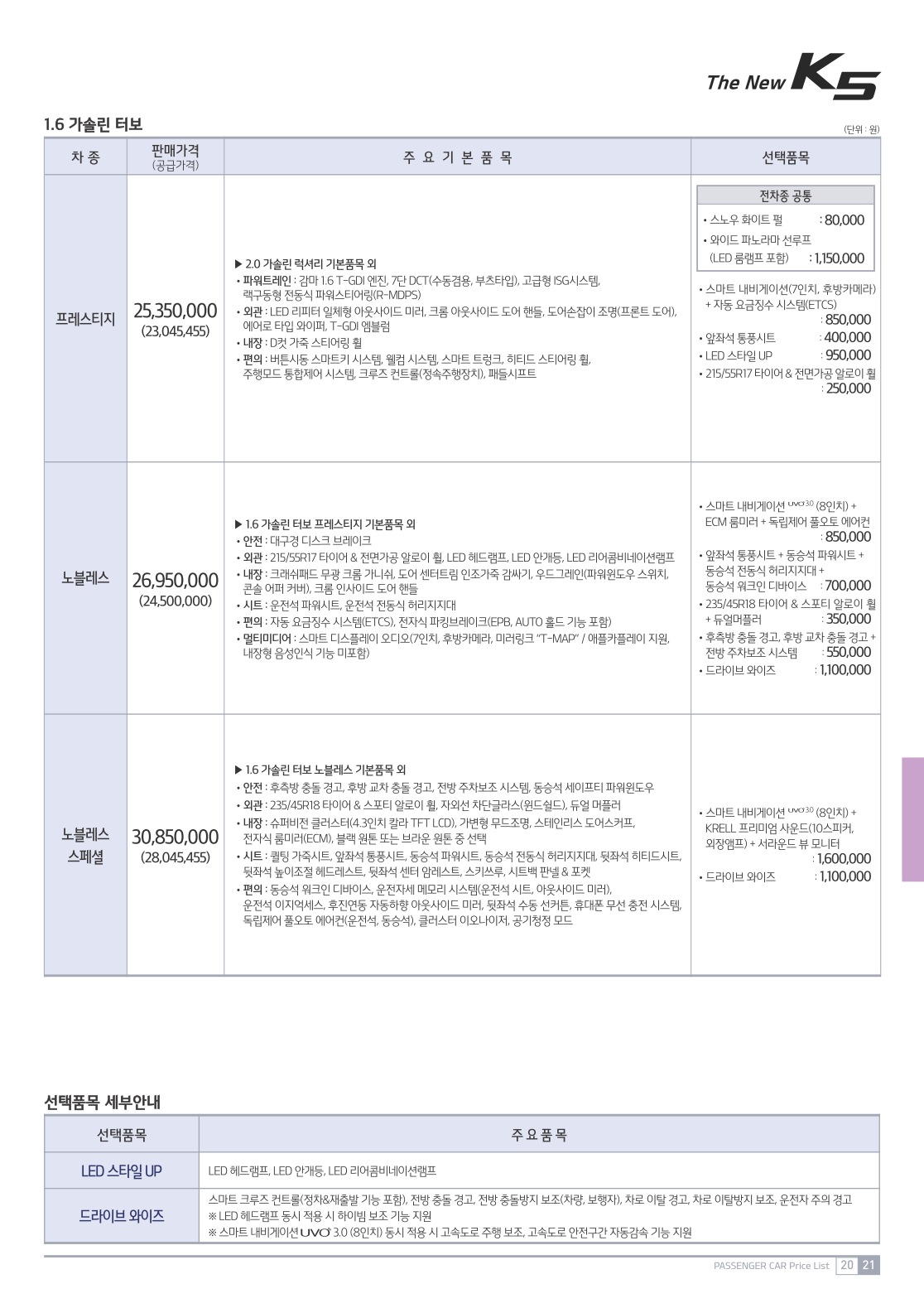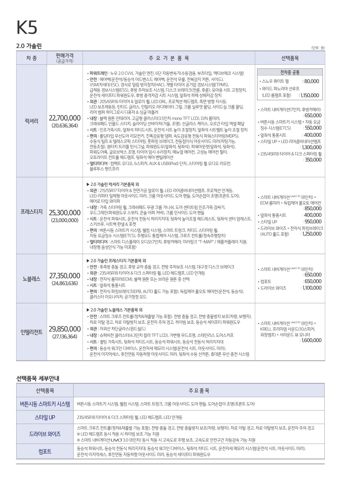 2019년 3월 K5 신차가격표 (2020년형 K5 신차가격표)