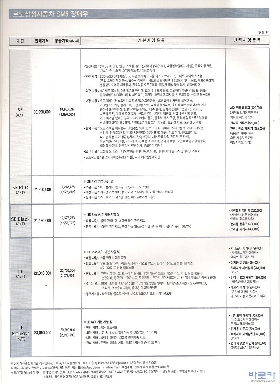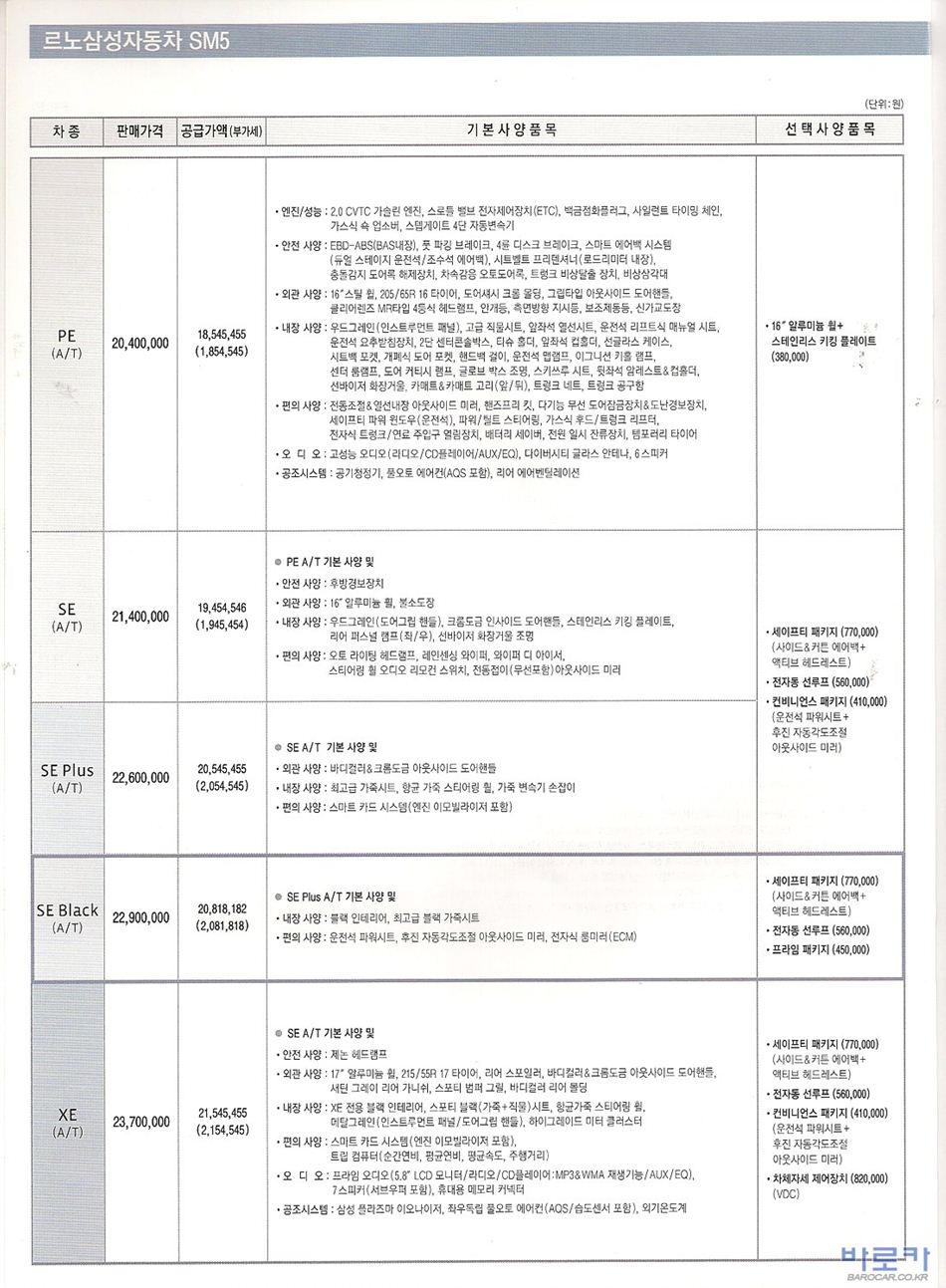 2009년 1월 SM5 신차가격표