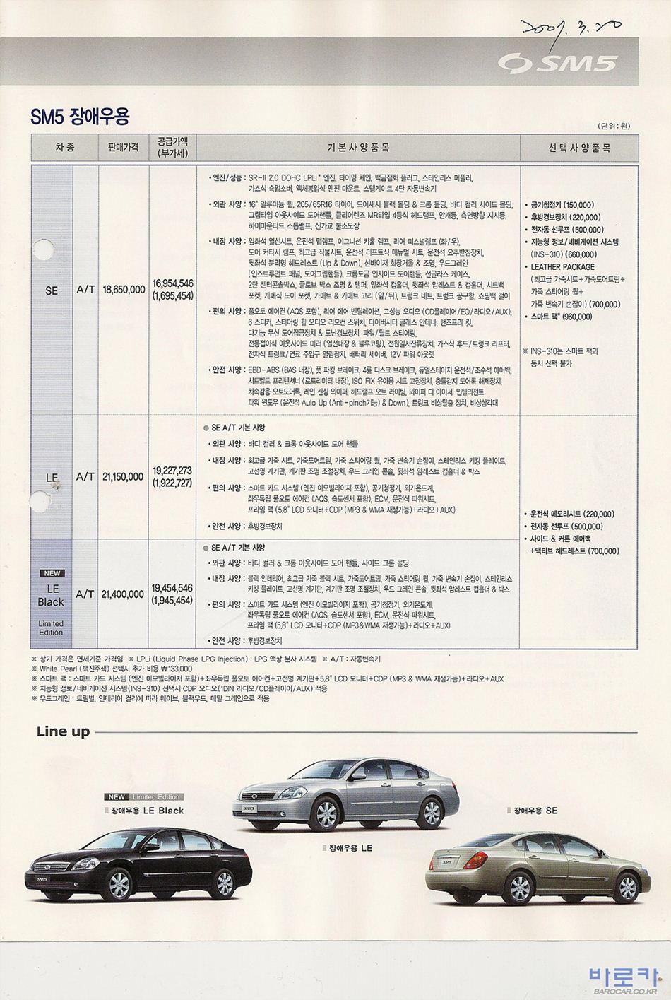 2007년 3월 SM5 신차가격표