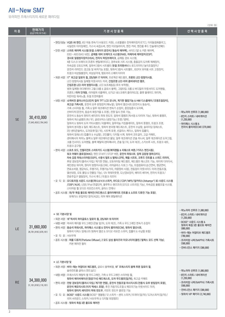 2012년 2월 SM7 신차가격표