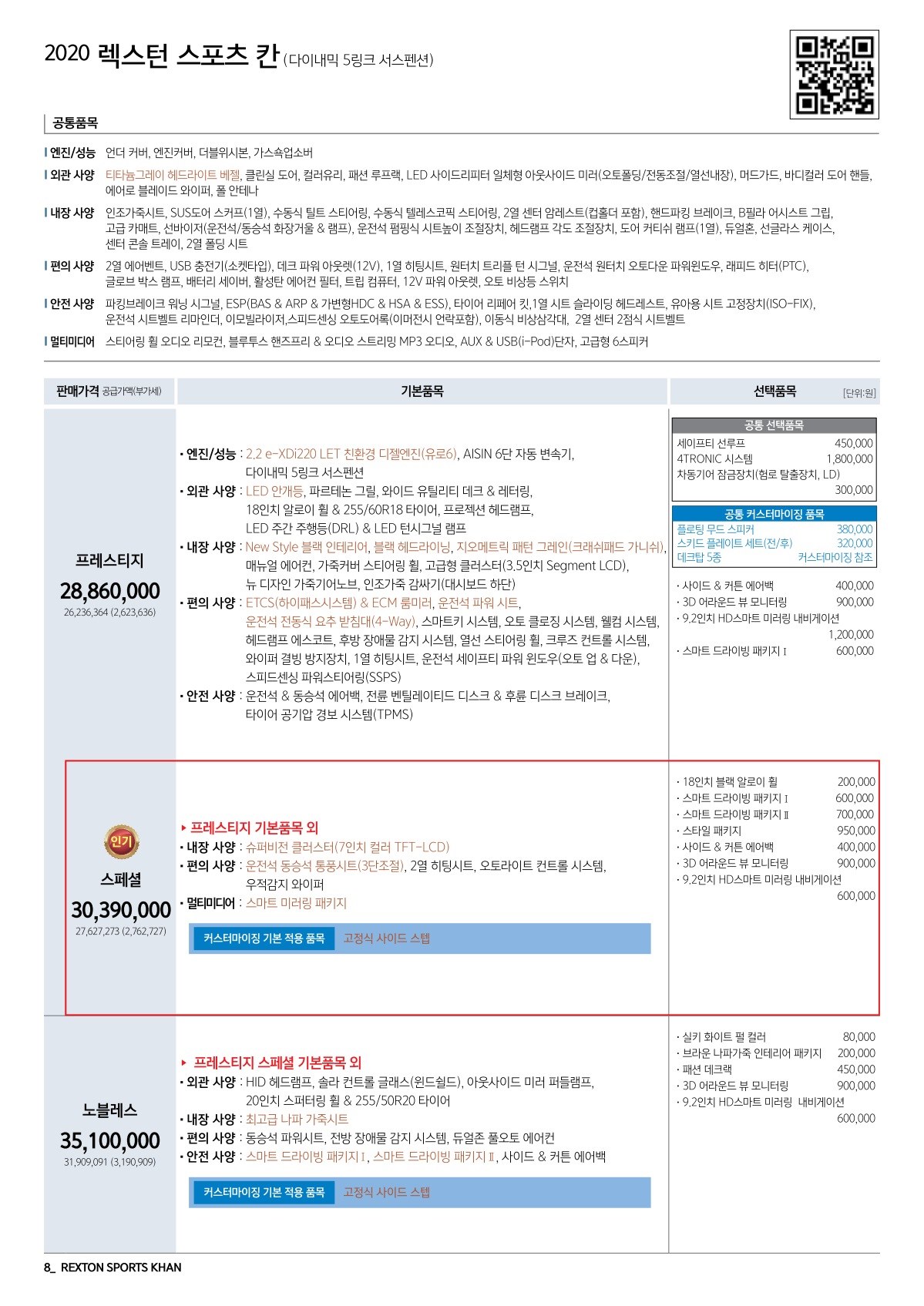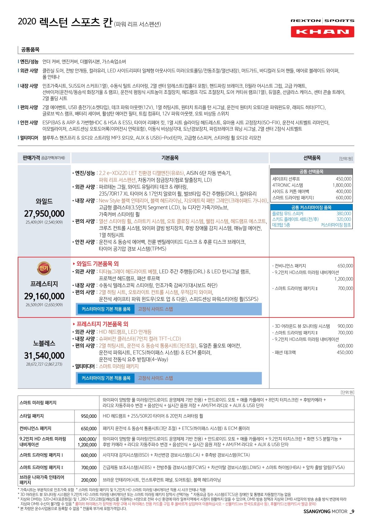 2019년 9월 렉스턴 스포츠 신차가격표 (2020년형 출시)