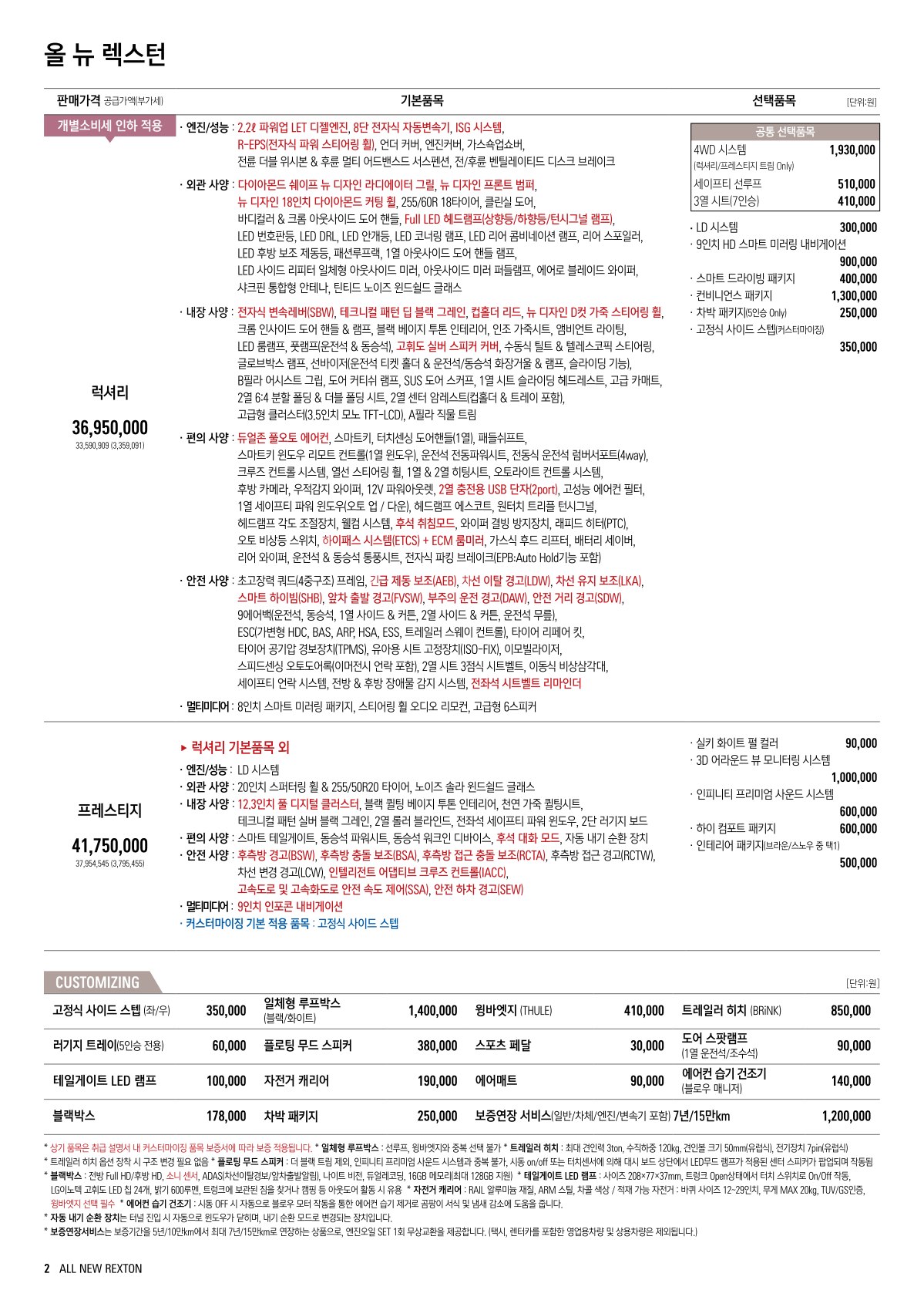 2020년 11월 올뉴렉스턴 신차가격표 (올뉴렉스턴 출시)