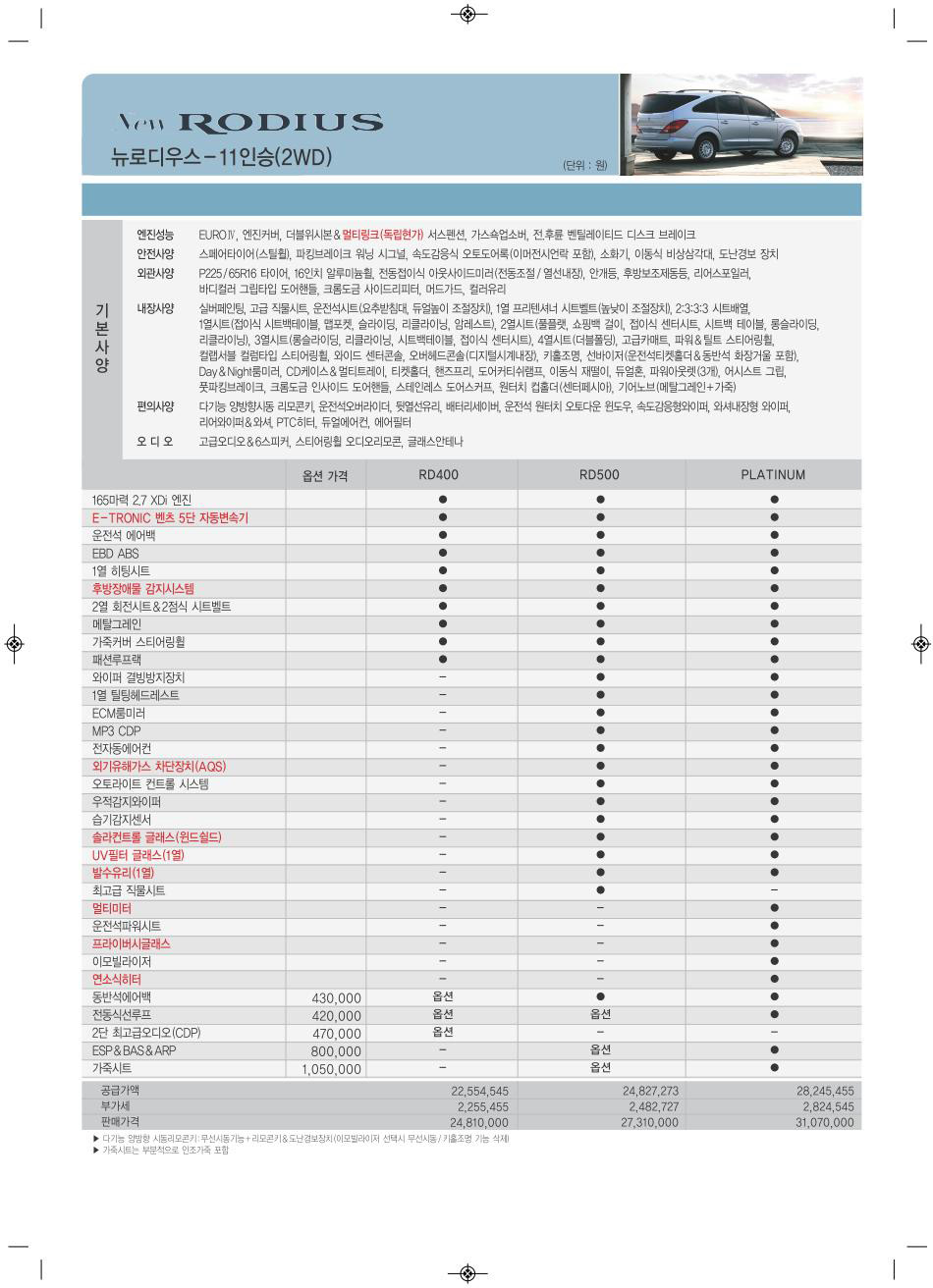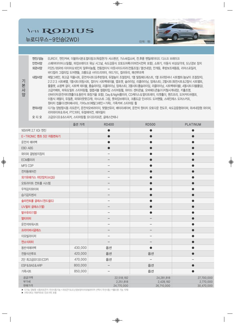 2010년 12월 로디우스 신차가격표