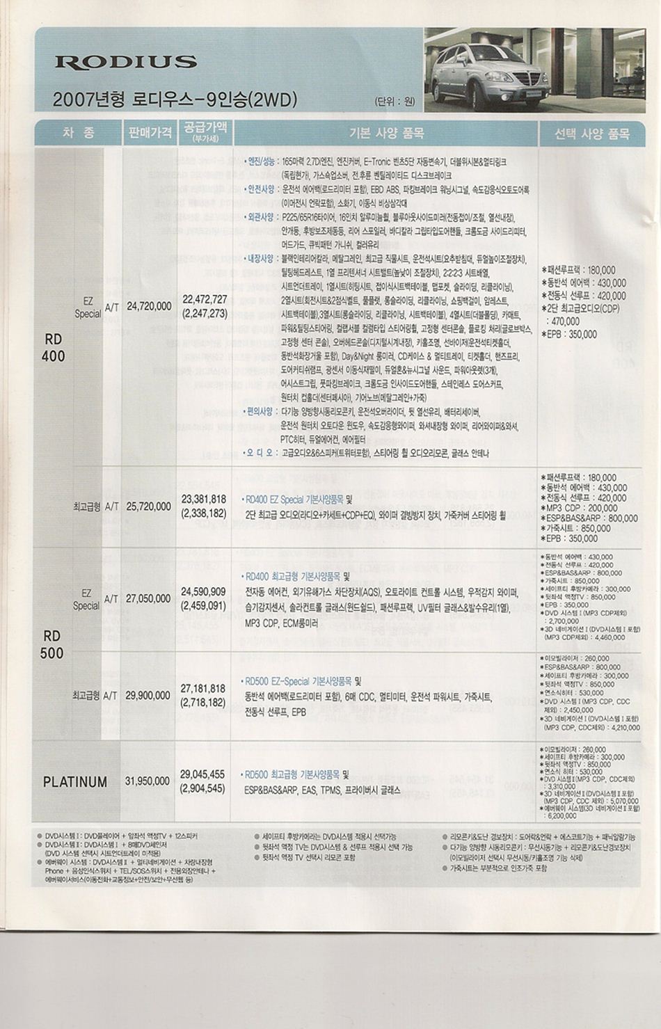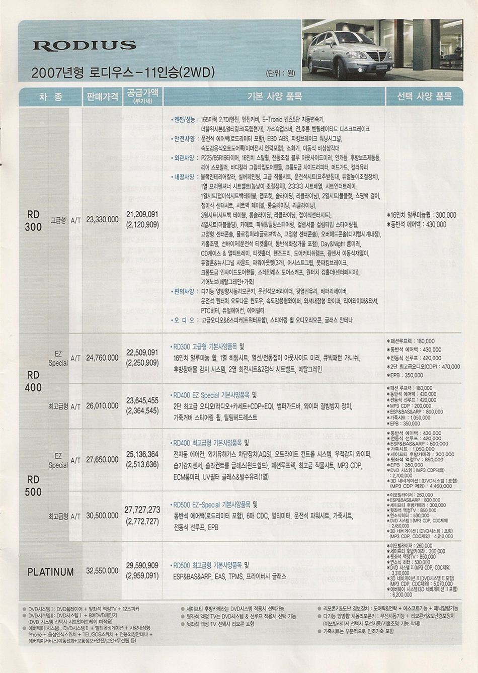 2007년 9월 로디우스 (뉴로디우스) 신차가격표