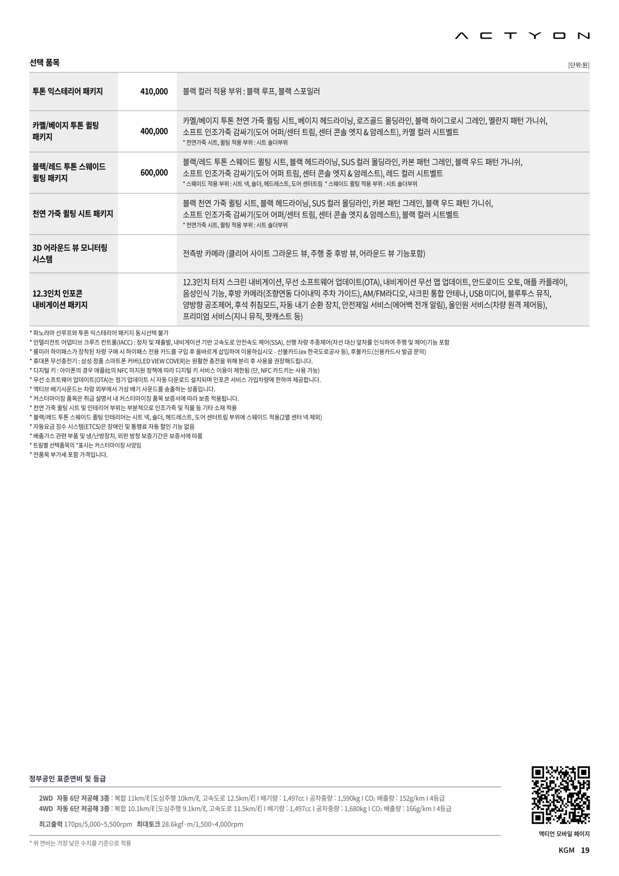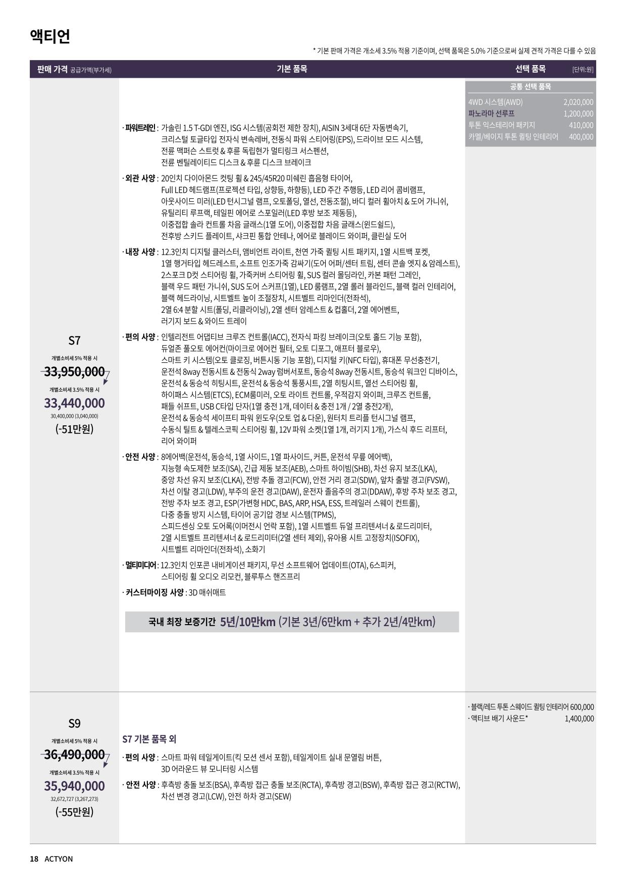 2025년 2월 액티언 신차가격표 (파노라마 썬루프 추가)