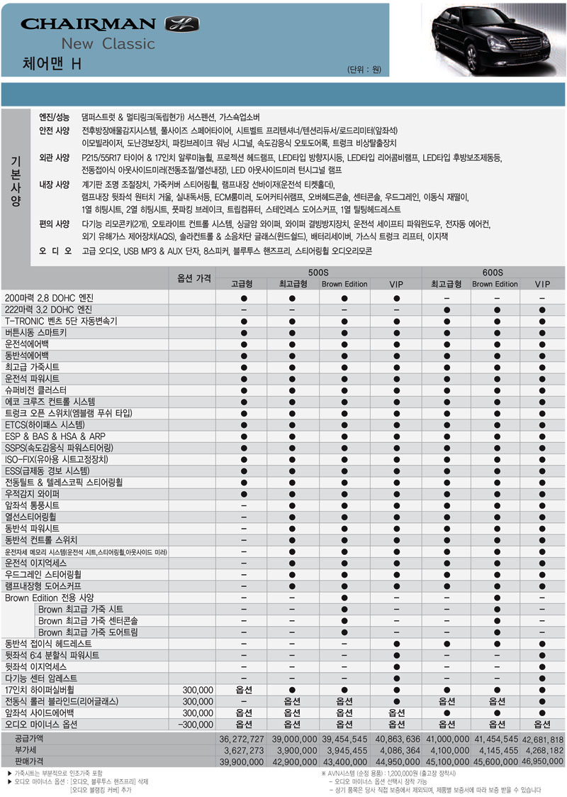 2011년 6월 체어맨H 뉴클래식 신차가격표